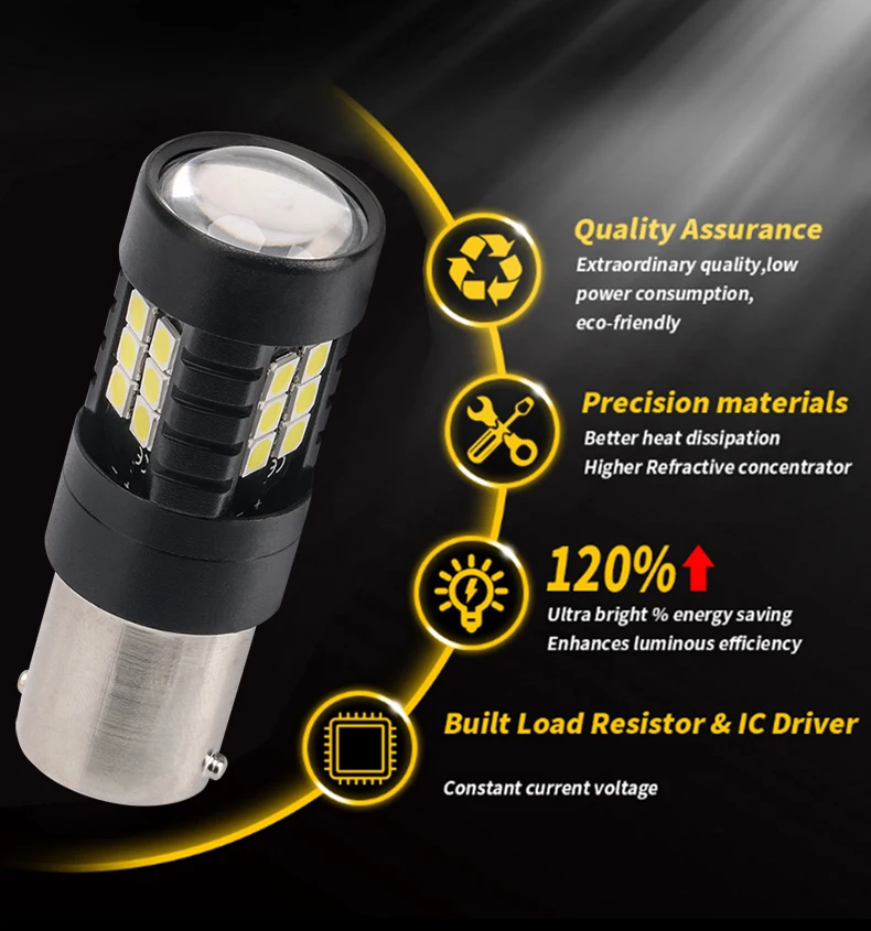 Напряжение: 12V-24V (шире Напряжение, так и грузовых автомобилей) Мощность: 7,5 W Тип разъема: (1156-P21W-BA15S) (1157-P21/5W-BAY15D) (1156-PY21W-BAU15S) Светильник: 21*3030 SMD супер яркость Яркость: 1000 лм на светильник Угол освещения: 360 градусов Срок службы:> 50000 рабочих часов Гарантия: 12 месяцев