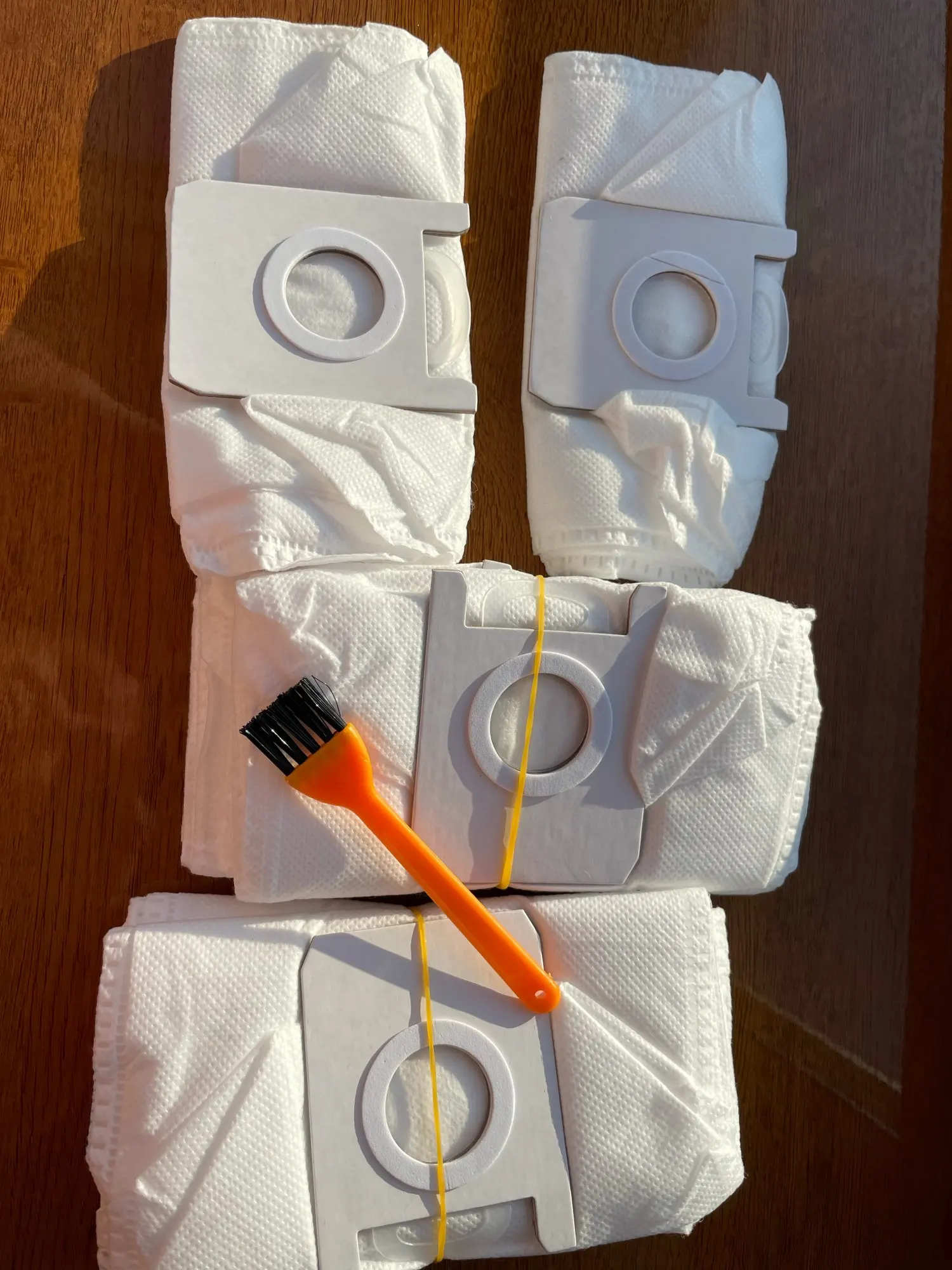 Пришли с задержкой. В подарок щеточка. На последнем фото сравнение с оригиналом, слева оригинальный мешок. Отличается немного формой мешка, ткань очень похожа, крепление как у оригинала. Стоимость мешка в районе 100 рублей, хватает на два месяца. Ничего колхозить не надо. Рекомендую