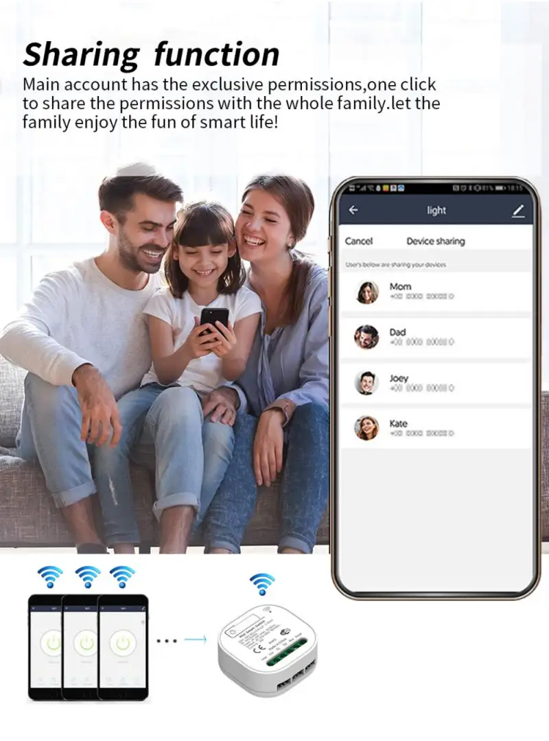5. Общий доступ и групповое управление: Одно нажатие, чтобы поделиться смарт-переключателем с вашим членом семьи с помощью приложения, чтобы устранить дополнительные процессы настройки. Главная учетная запись имеет эксклюзивные разрешения, один клик, чтобы поделиться eht разрешениями со всей семьей. Позвольте семье насладиться веселой умной жизнью!