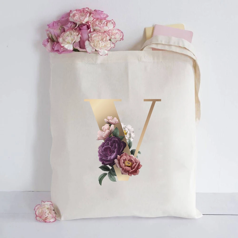 Сумка на плечо с золотым алфавитом, цветочный узор, сумка для покупок, сумка для хранения из парусины, женская переносная сумка из эко-ткани, складной органайзер