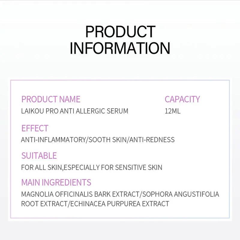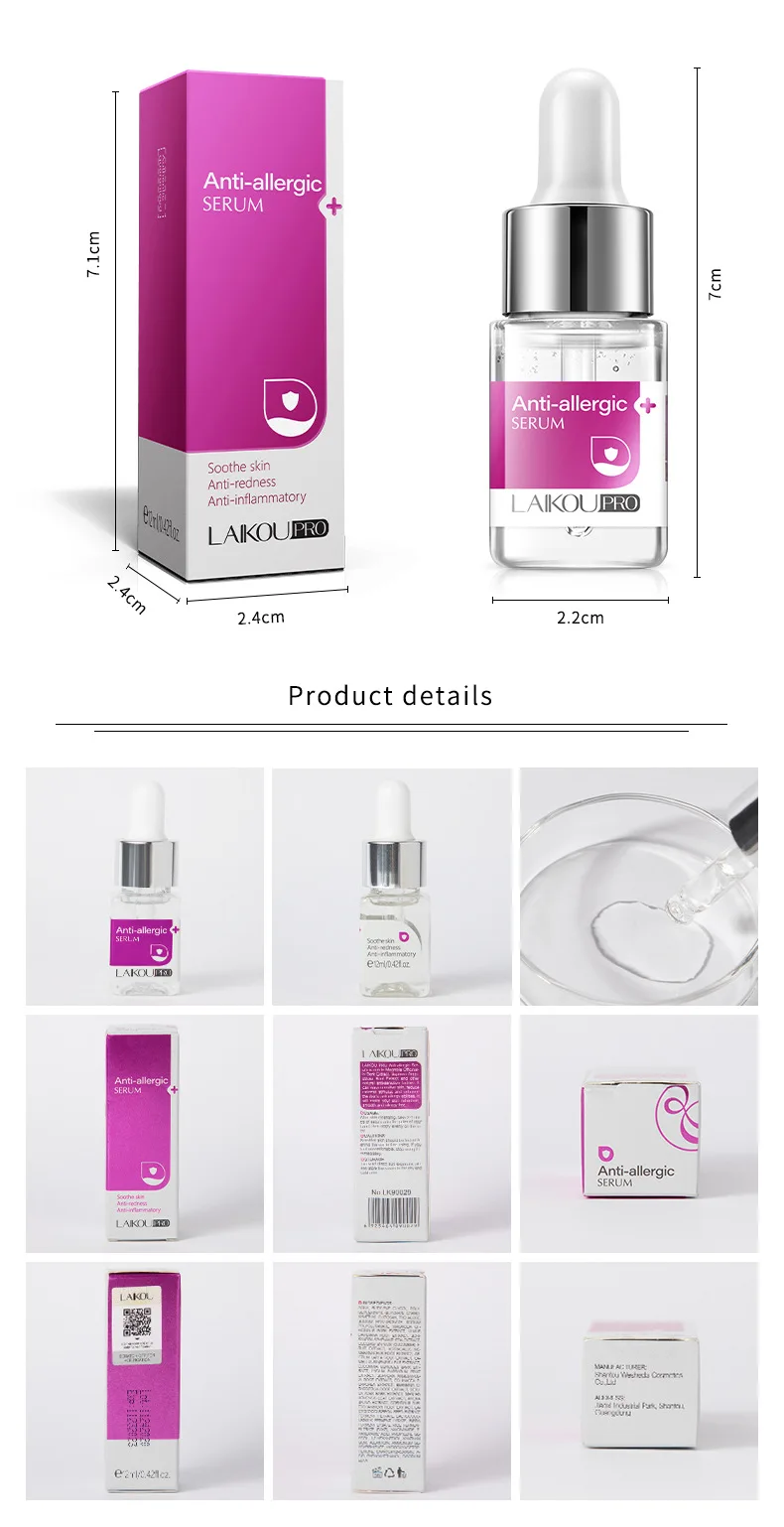 Бренд: LAIKOU Название продукта: эссенция Применимое Количество: общее Подходящая кожа: обычная Происхождение: Китай Срок годности: 3 года Содержание нетто: 12 мл (г/мл) Эффективность: увлажнение, увлажнение, отбеливание и защита от старения Состав: официальный экстракт коры магнолии, экстракт корня софоры ангустифолии Влажный: 40 г Размер: 11*4*4 см LAIKOU PRO антиаллергическая сыворотка богата магнолией, экстракт коры, экстракт корня софоры ангустифолии и другие природные античувствительные факторы. Это может облегчить чувствительную кожу, уменьшить экстемный раздражитель и повысить антиаллергенные способности кожи. Она сделает вашу кожу более гладкой и не вызывает аллергии.