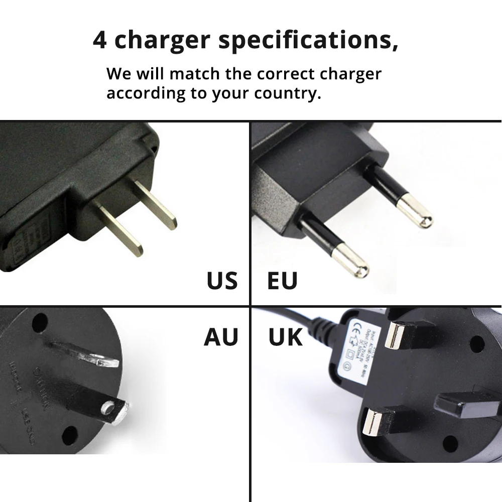 4 вида спецификации зарядного устройства, мы выберем правильное зарядное устройство в соответствии с вашей страной. Потому что это ручной выбор, неизбежно, что будет неправильное решение. Я надеюсь, вы можете сообщить нам, какая Спецификация зарядного устройства вам нужна в сообщении о заказе. Спасибо.