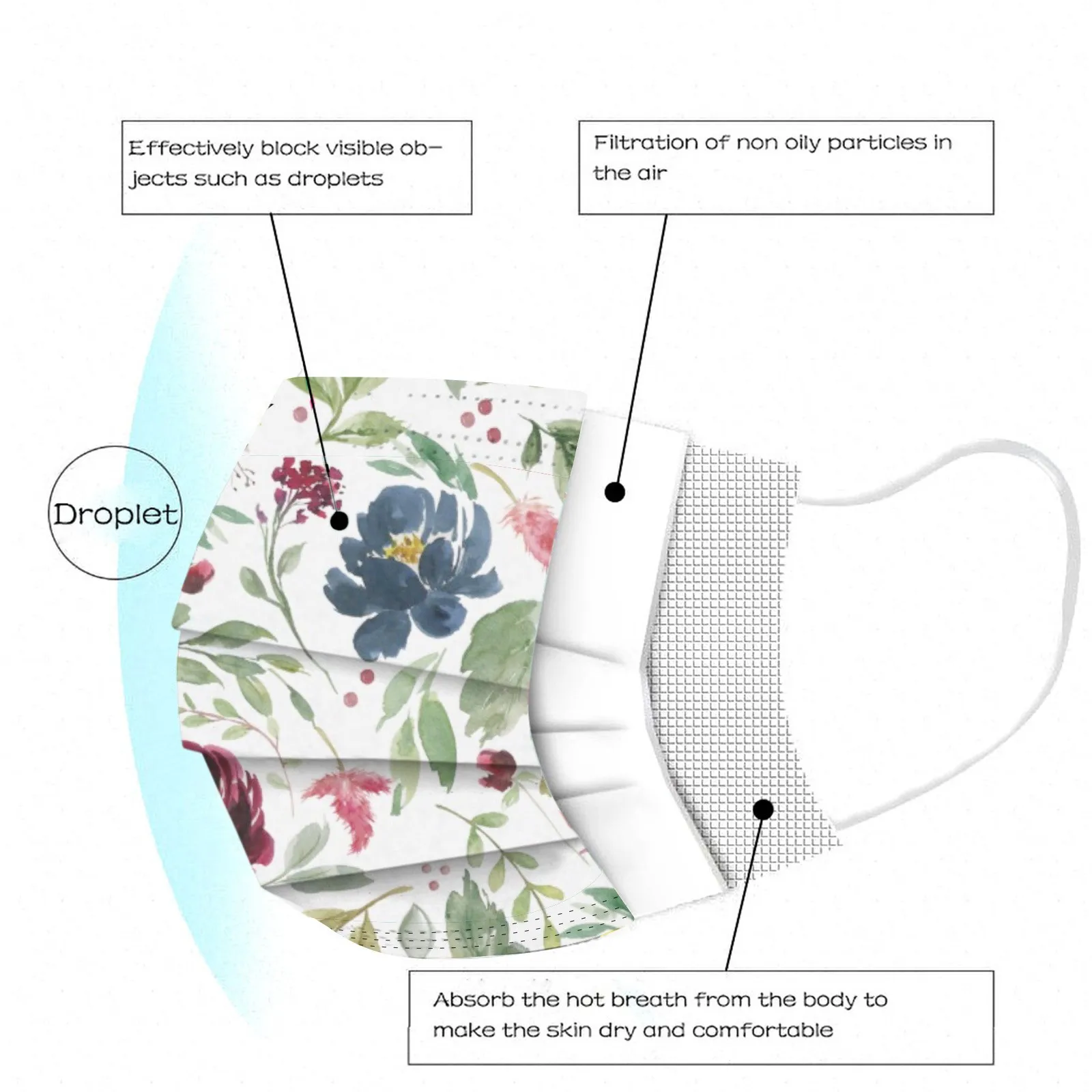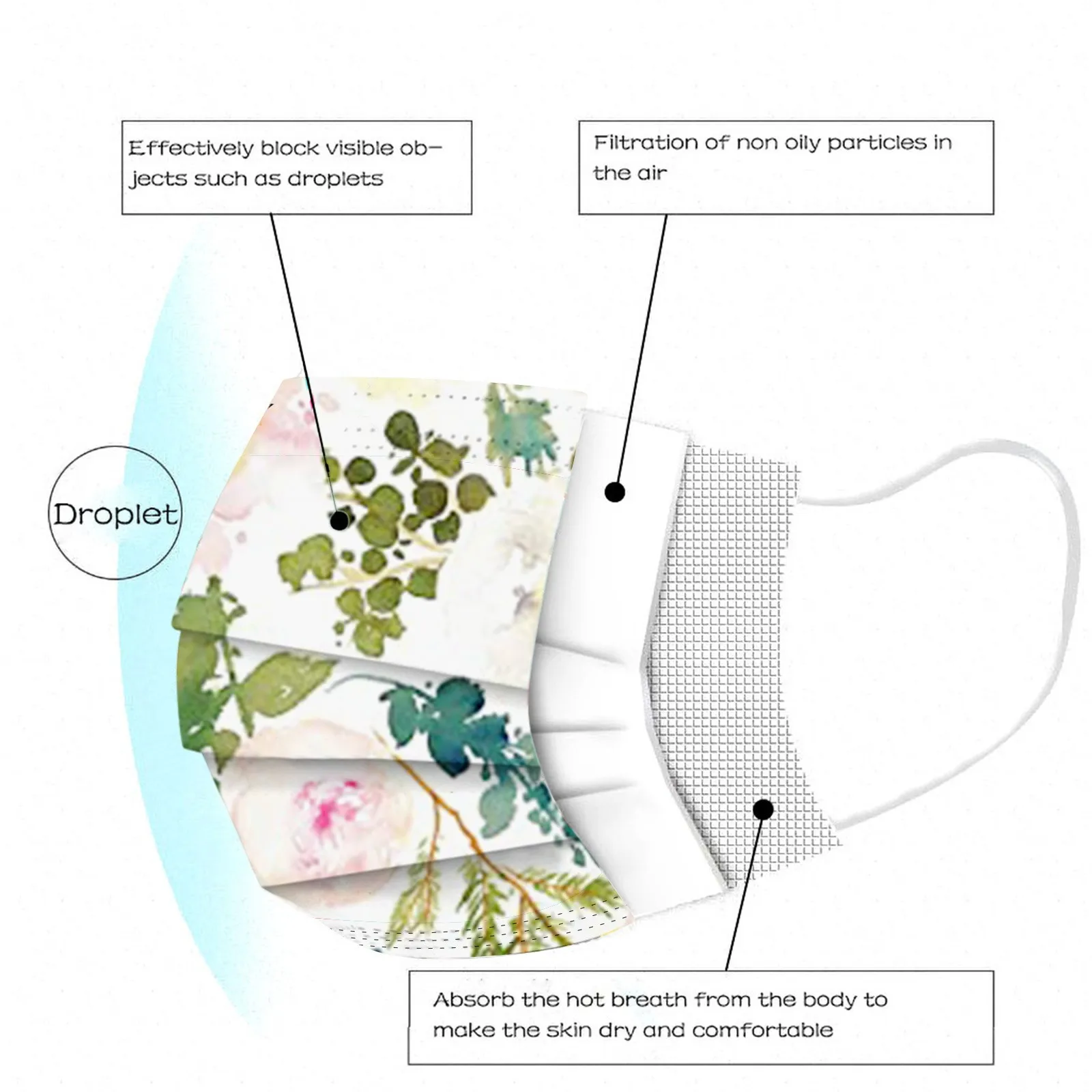 50 шт. модные одноразовые маски для лица для женщин цветочный дизайн 3-слойные защитные маски для рта женские маски для Хэллоуина косплея маски