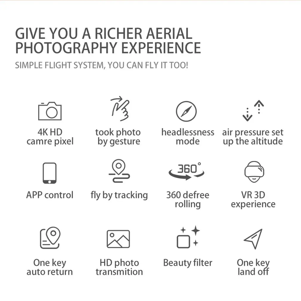 Описание:Складной мини-Дрон имеет складные руки, малый размер, легко носить с собой, с функцией режима удержания высоты, полет стабильный.В безголовом режиме нет необходимости регулировать положение самолета перед полетом.Самолет с пультом дистанционного управления может легко найти свой путь домой с помощью функции обратной связи с одной кнопкой.Игрушка квадрокоптера может снимать Потрясающие фотографии и видео с неба, имеет различные пиксели по желанию.Радиоуправляемый самолет имеет функцию Wi-Fi, вверх/вниз, вперед/назад, влево/вправо поворот, боковой светильник f, светодиодный светильник, Безголовый режим, автоматическая кнопка возврата, режим удержания высоты, wiFi FPV и многое другое.Спецификация:Материал: АБС-пластик и электронные компоненты.Цвет: черный/серый белый.Квадрокоптер Размеры: 10x5x12,5x3 см (в разложенном виде), 8x6,5x3 см (в сложенном виде).Частота: 2,4G.Канал: 4CH.Мотор: матовый без сердечника.Батарея: 3,7 V 650 мА/ч, Батарея (все указанные аккумуляторы входят в комплект поставки).Мощность передатчика: 3 аккумулятора AAA (не входят в комплект).Режим передатчика: режим 2 (левая дроссельная заслонка).Время полета: около 11-13 минут.Время зарядки: 40 минут.Дистанция RC: 50-80 м.Расстояние FPV: 30-50 м.FPV: WiFi.Разрешение: 30W-480P, 500W-1080P, 4K (опционально).Угол обзора камеры: фиксируется на 25 °.Примечание:Из–за разных компьютерных разрешений может быть небольшое цветовое искажение.Возможны незначительные погрешности из-за различных ручных измерений.Посылка включает в себя:1 Дрон.1 пульт дистанционного управления.1x3,7 V 650 мА/ч, Батарея.1 x usb-кабель для зарядки.4 x запасные нарезки.4 x крышка.1 x руководство.1 х драйвер.