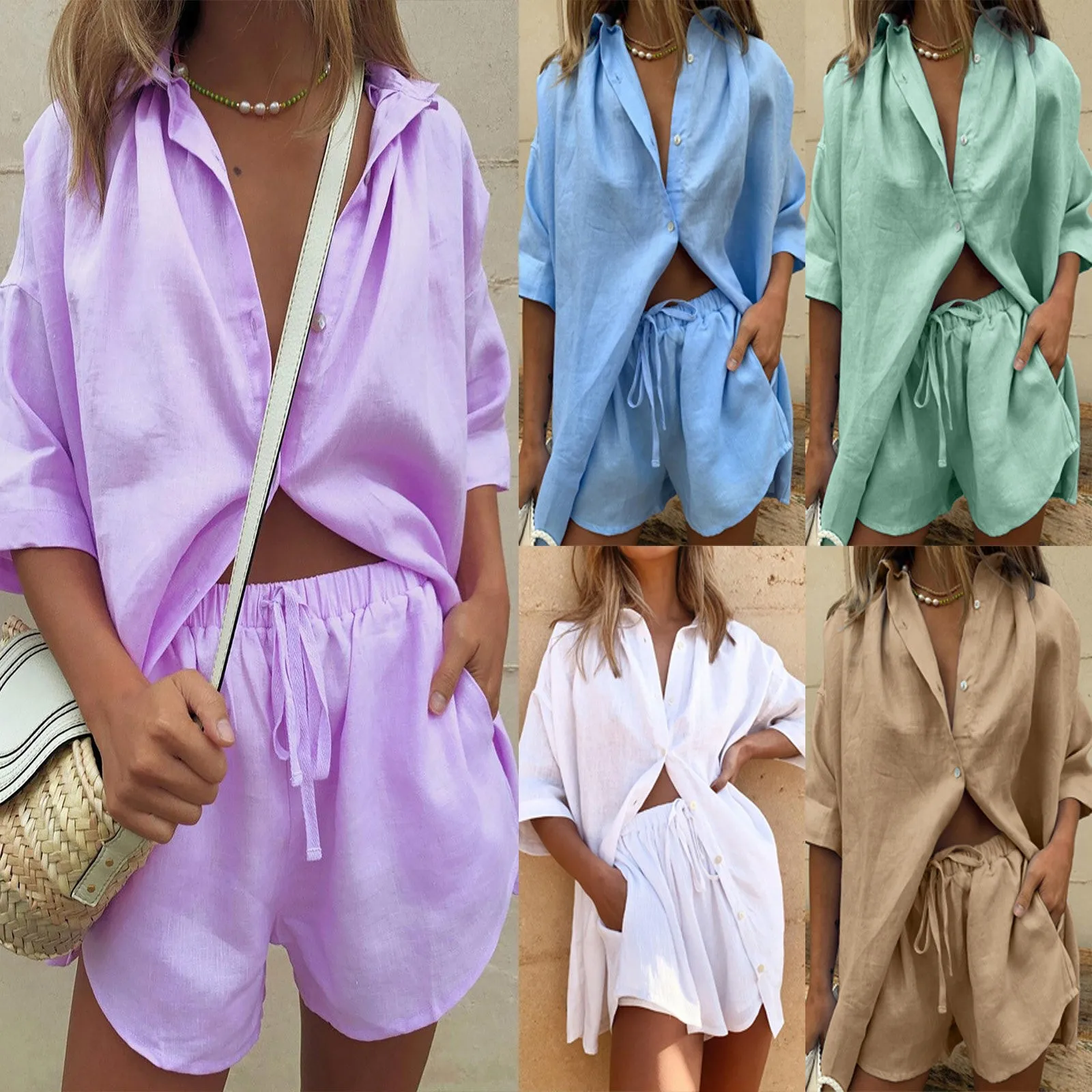 Женская Однотонная рубашка с коротким рукавом, шорты, СВОБОДНЫЙ Модный повседневный костюм