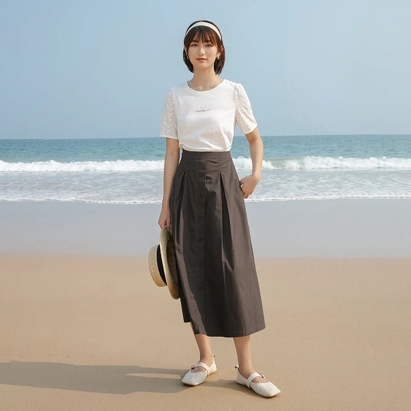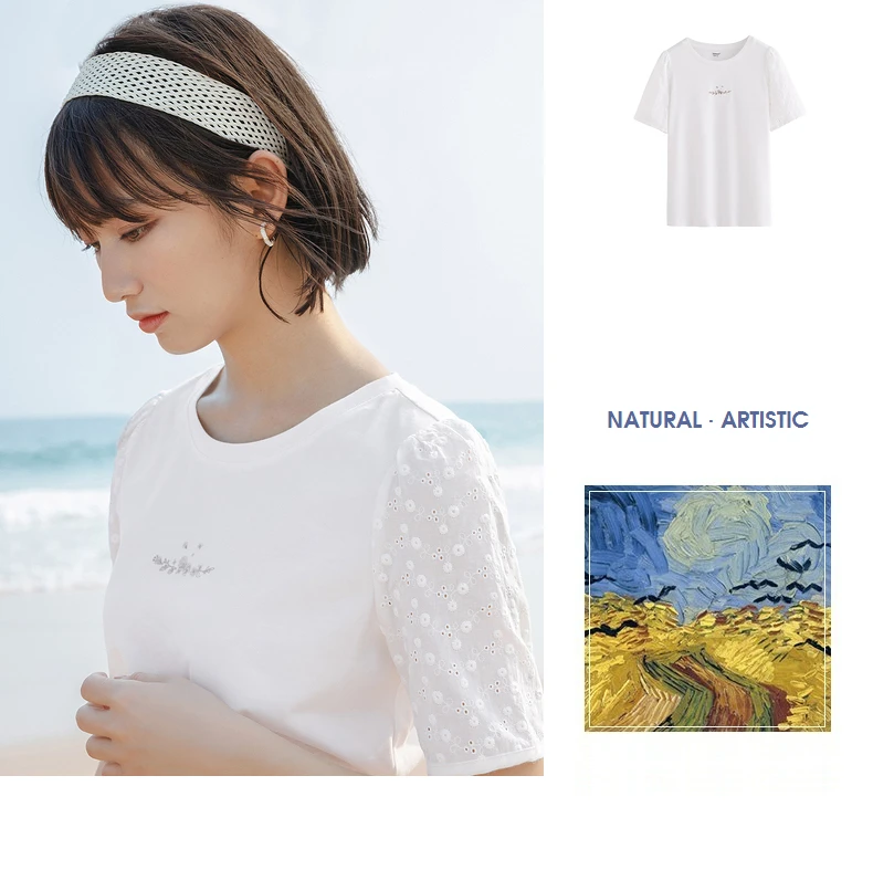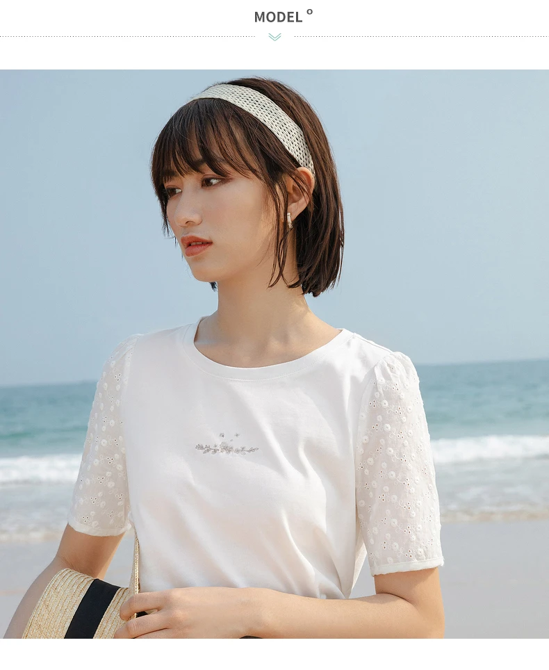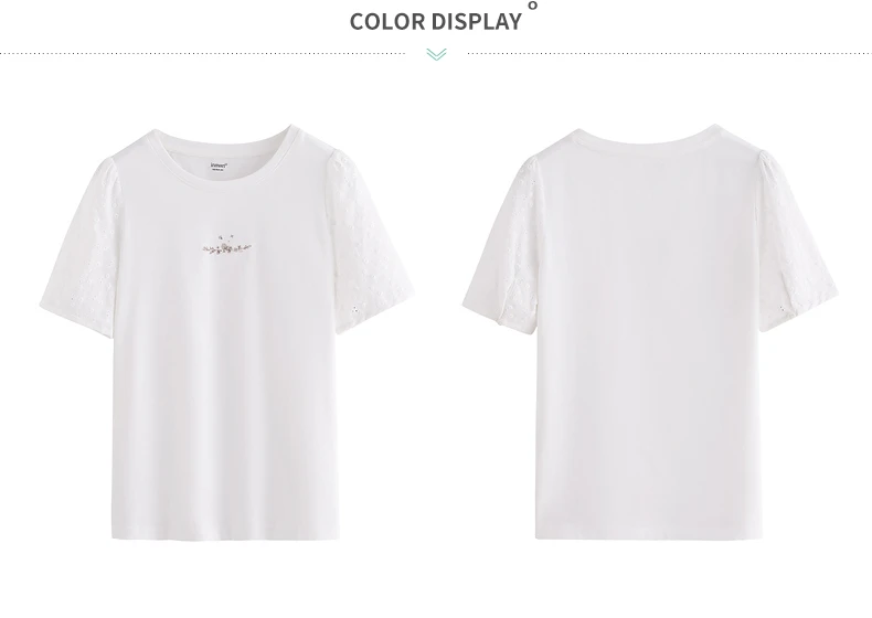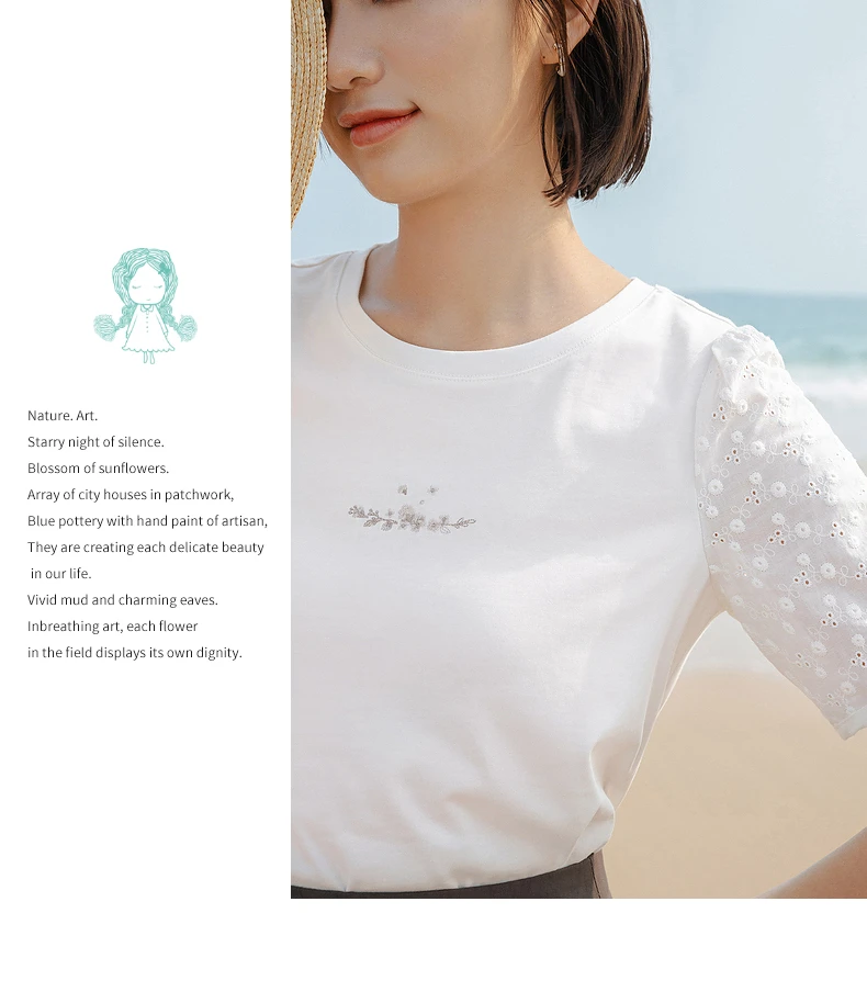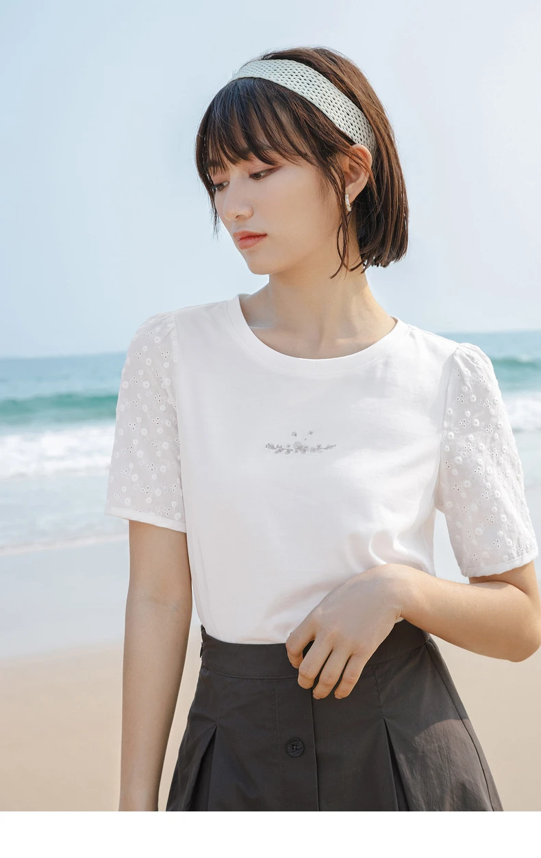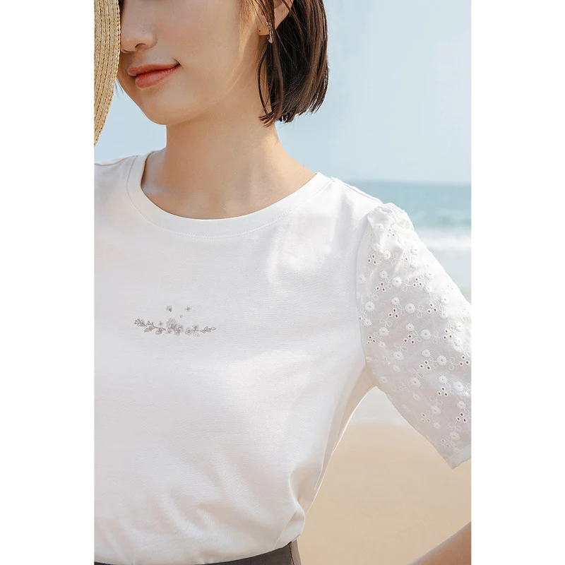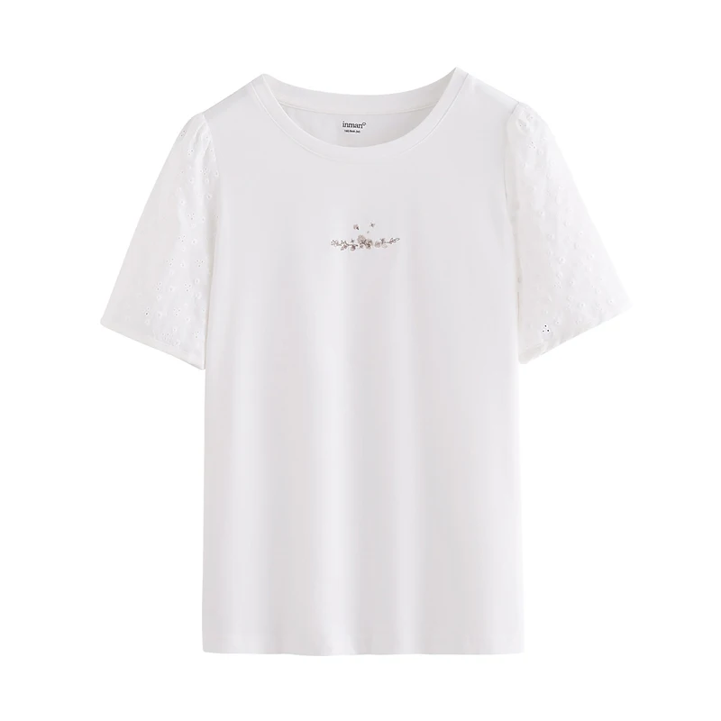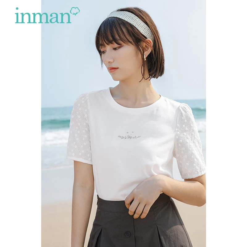 INMAN Летняя женская футболка с круглым воротником, плечами, трехмерным ажурным жаккардовым рукавом, вышитым листком, Простой Топ