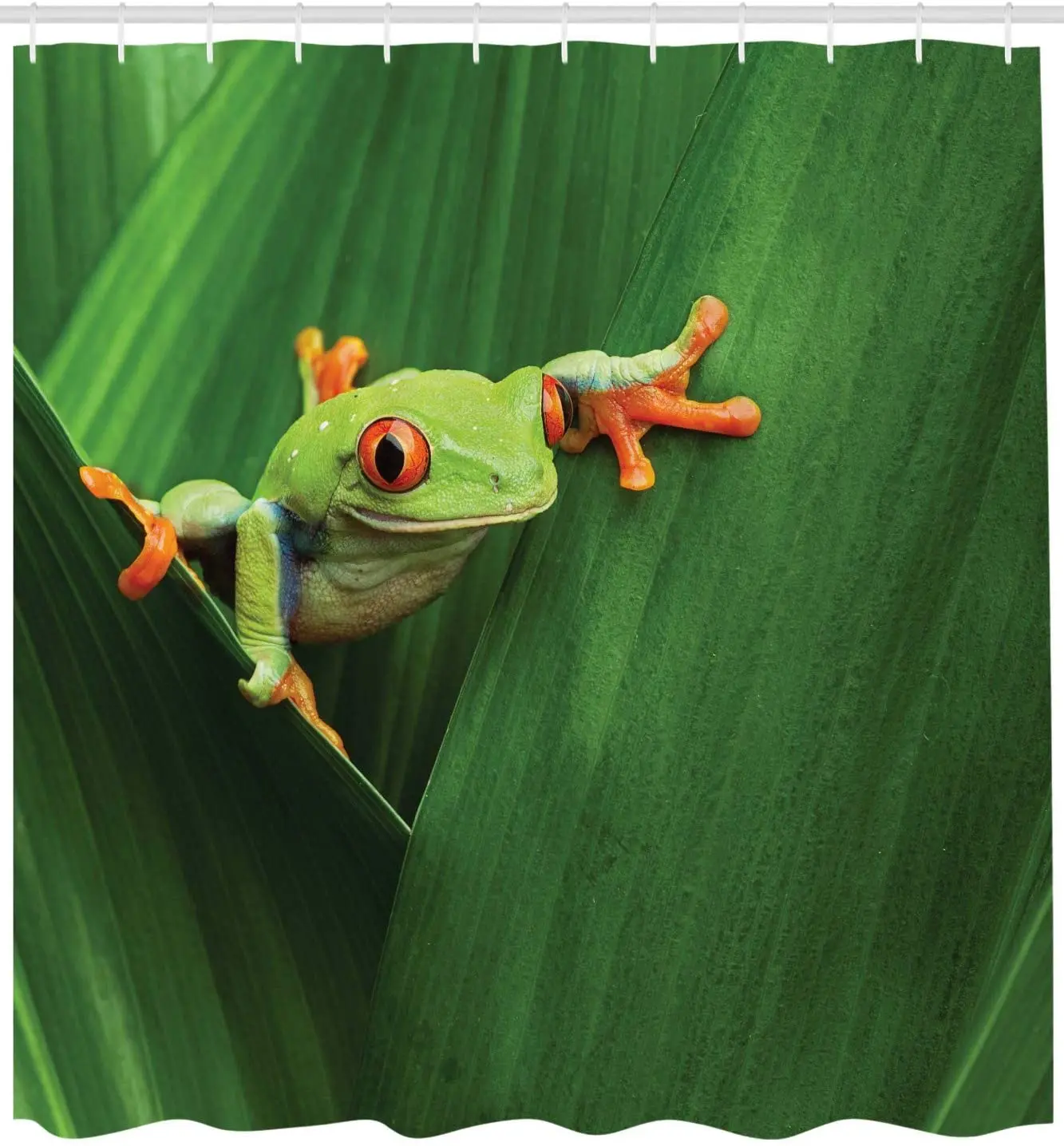 Зеленая душевая занавеска с животными, красная глазная лягушка между экзотическими макролистьями, большие дикие натуральные ночные животные, яркие цвета, занавеска для ванны