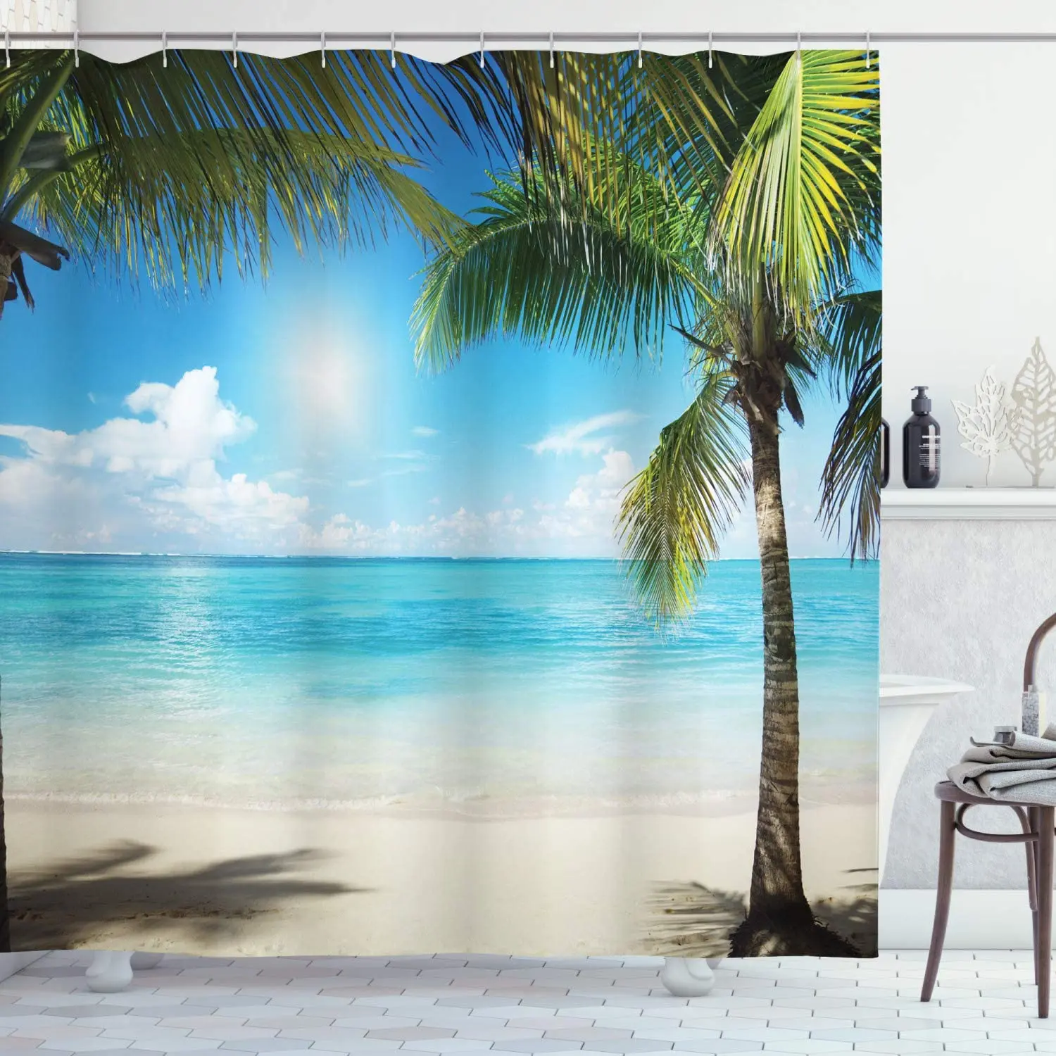 Кокосовое тропический зеленый занавеска для пляжного душа кокосовые пальмы тени на Карибского моря берега летняя футболка растения идиллический занавеска для ванны