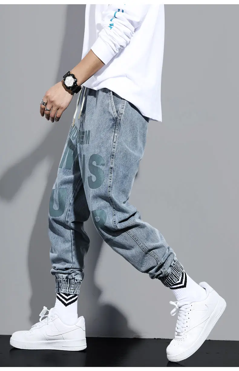 Джинсы мужские с буквенным принтом, свободные укороченные штаны, локомотивная японская мода, уличная одежда, шаровары, повседневные брюки до щиколотки в стиле Харадзюку