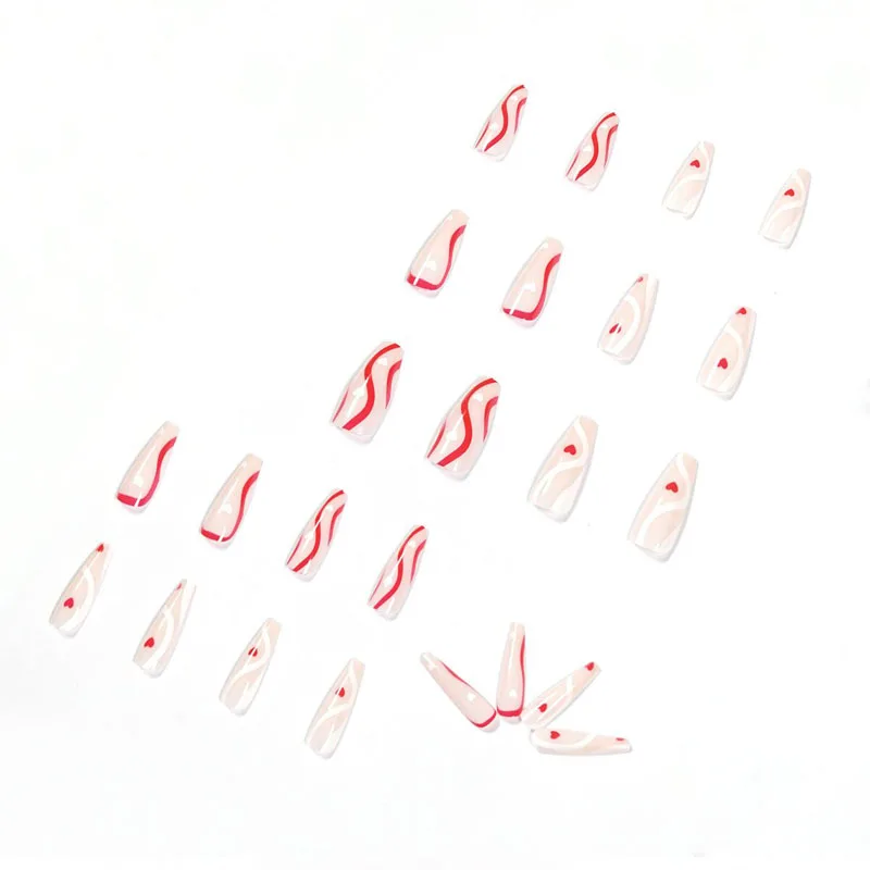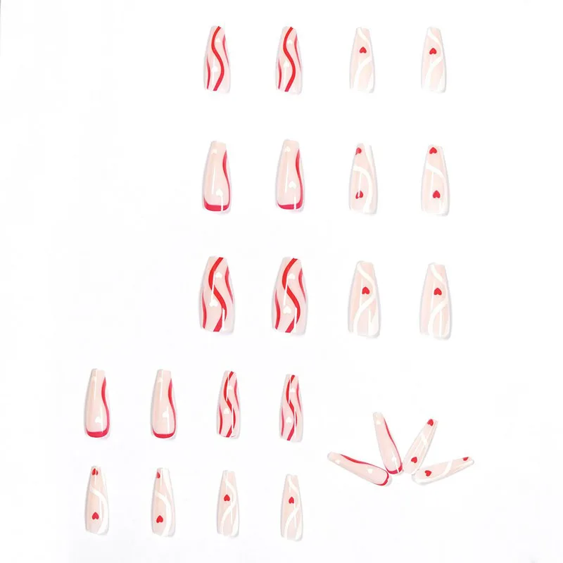 24 шт./компл., милые искусственные ногти с сердечками, Экстра длинные красные и белые линии, искусственные балерины, полные кончики для дизайна ногтей, искусственные губки с клеем