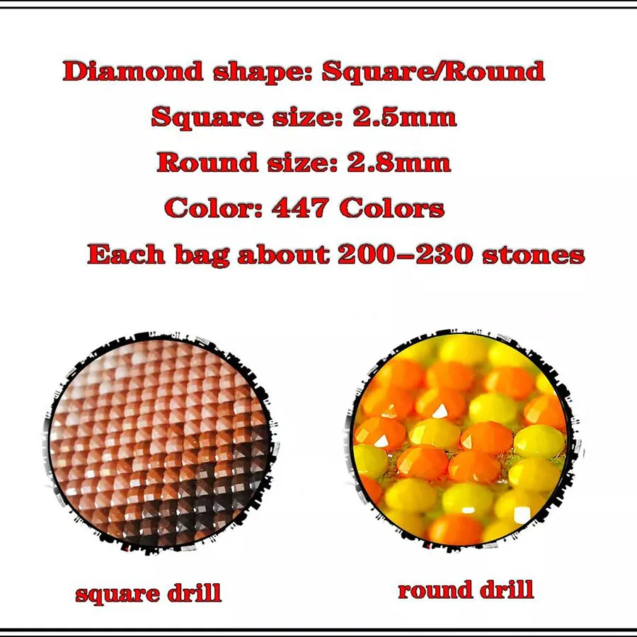 Тип алмаза: 2,5 мм квадратный алмаз, 2,8 мм круглый бриллиант Материал: квадратный/круглый алмаз из смолы