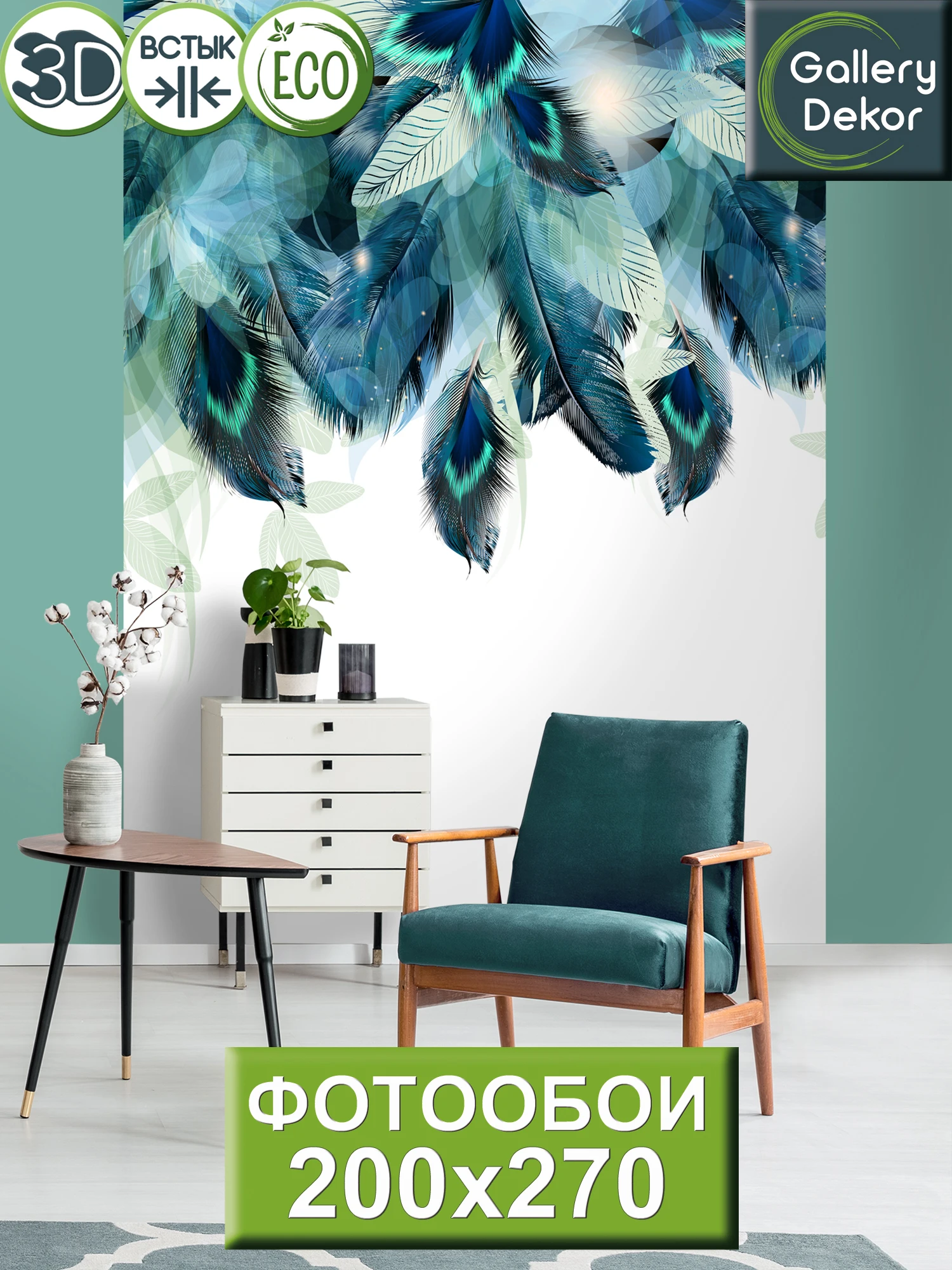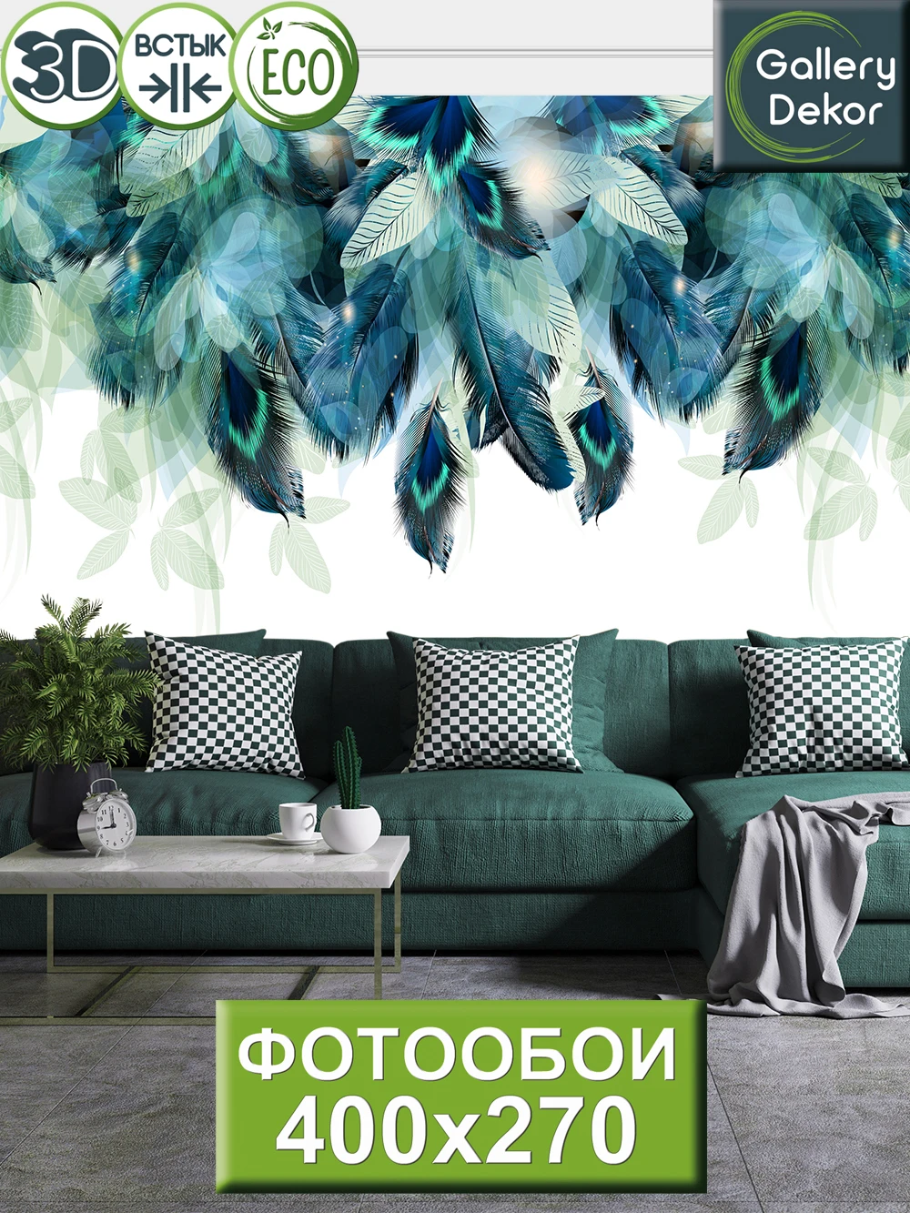 Фотообои Gallery Dekor 3D на стену флизелиновые панно Перья павлина бирюзовые на белом