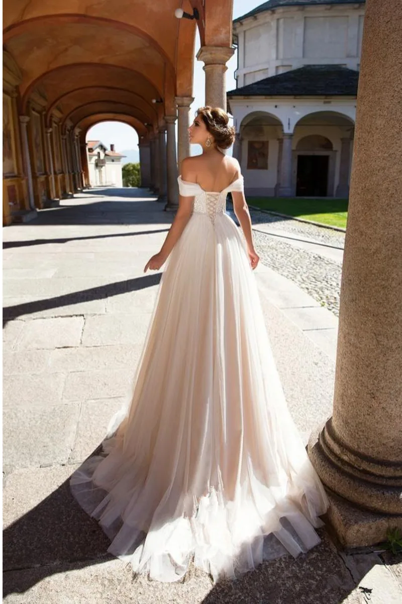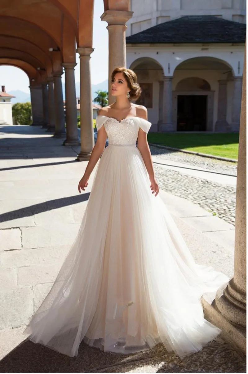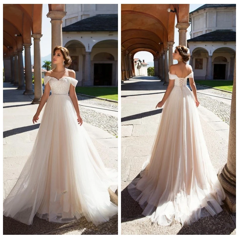 Пляжное свадебное платье 2021, простой сексуальный светильник с открытыми плечами, цвета шампанского, тюль, Кружевная аппликация, корсет, сзади, свадебные платья, Vestido De Noiva