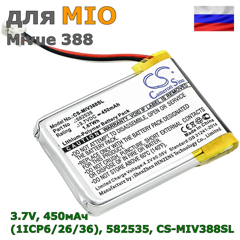 Емкость: 450mAh, 3.7VТип: Li-PolymerРазмеры: 35.6 x 24.6 x 5.8ммВес: 8гСертификаты соответствия (Certificates): CE, FCC, RoHS, РСТПроизводитель: Cameron SinoГарантия: 12 мес.Подходит для MIO Mivue 388