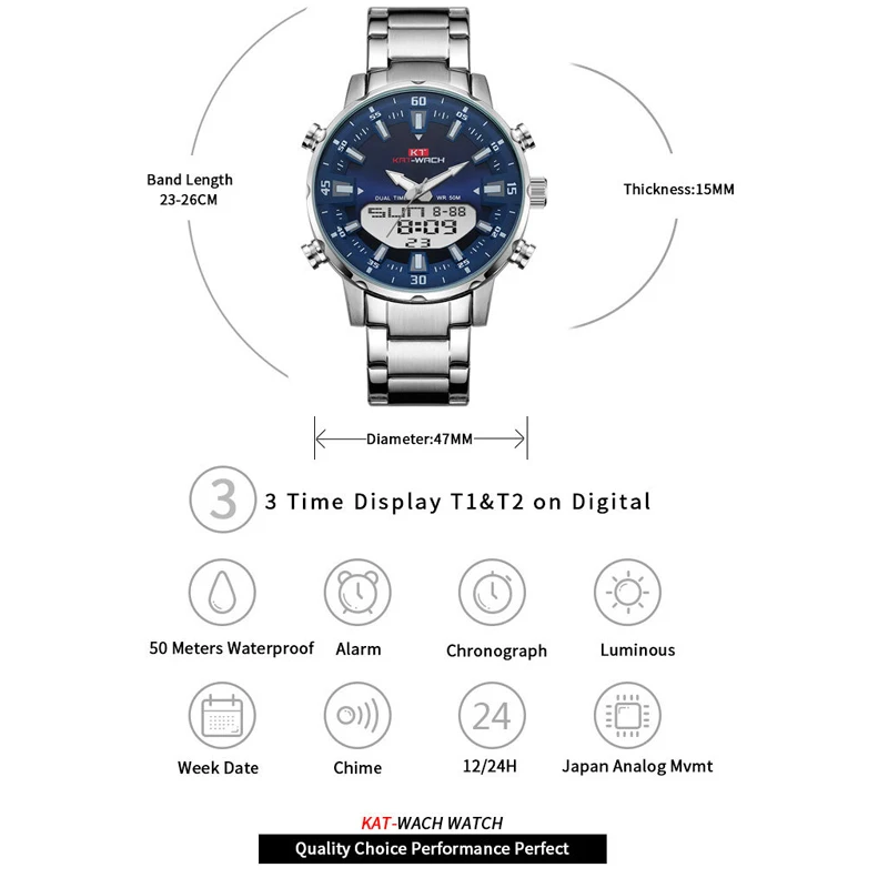 Часы мужские кварцевые, водонепроницаемые, 50 м, с двойным дисплеем