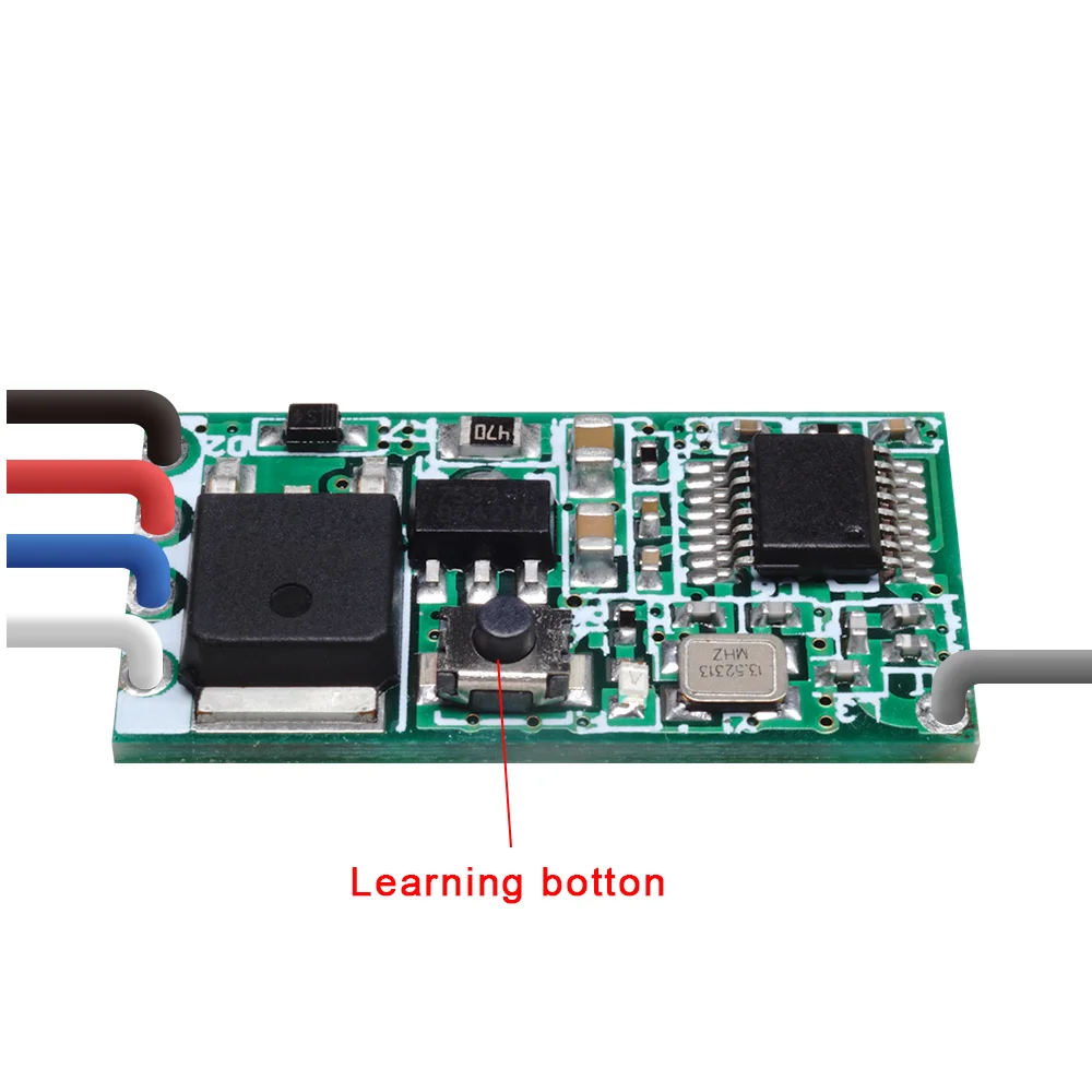 4,Режим фиксации:Нажмите кнопку обучения модуля 3 раза, светильник индикатора всегда включается, а затем нажмите кнопки на пульте дистанционного управления, светильник индикатора мерцает три раза, а затем выключается, затем обучение успешно; Если код не был успешным, Световой индикатор выходит из состояния исследования через 15 секунд.