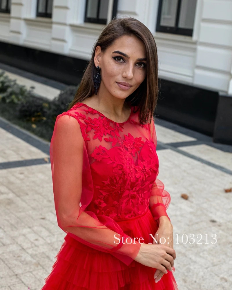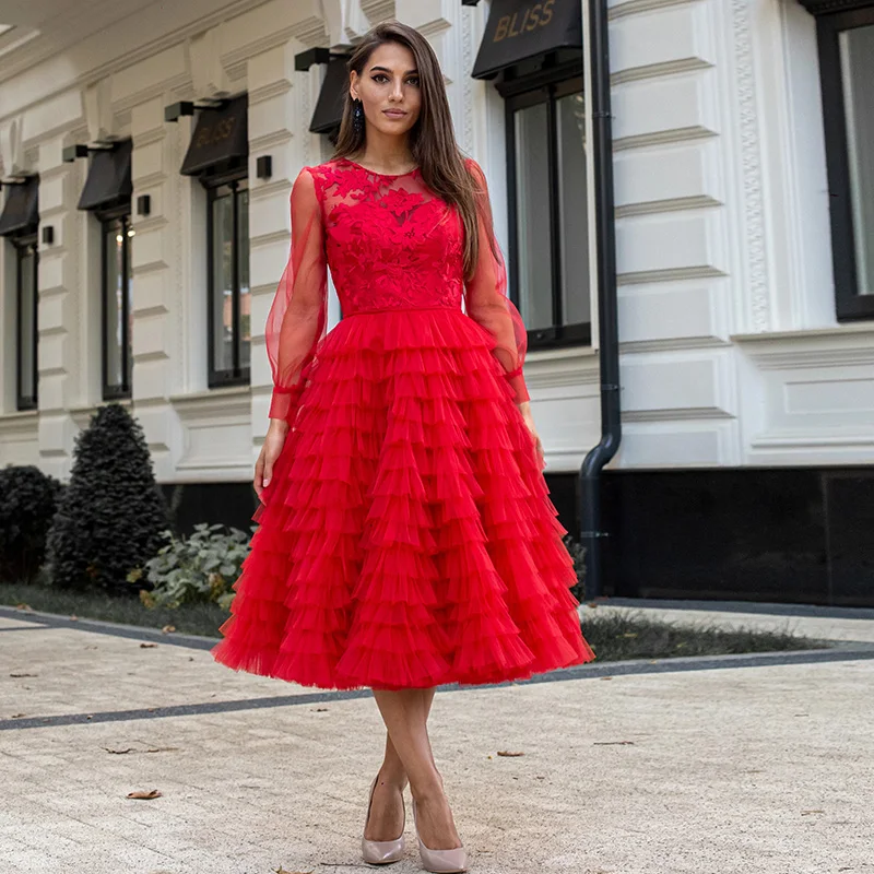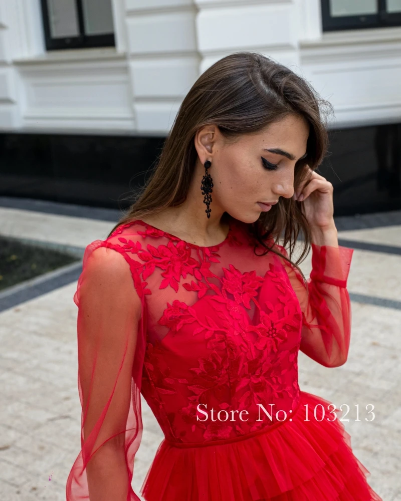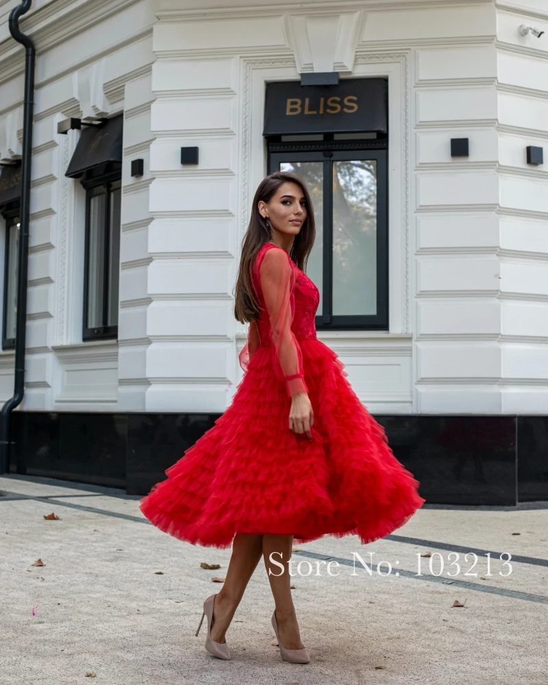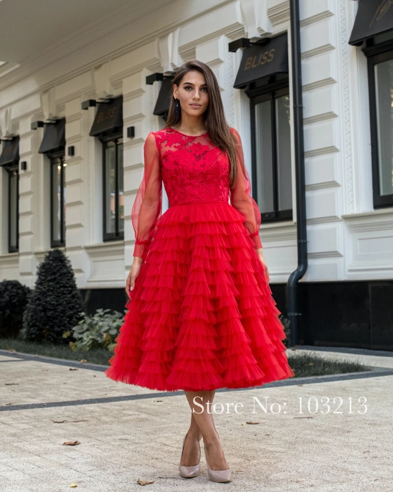 Великолепные красные вечерние платья с длинным рукавом, ТРАПЕЦИЕВИДНОЕ Тюлевое платье с оборками длиной ниже колена для вечеринки, 2021