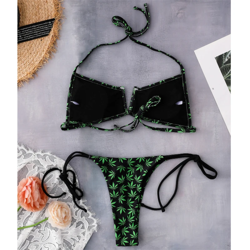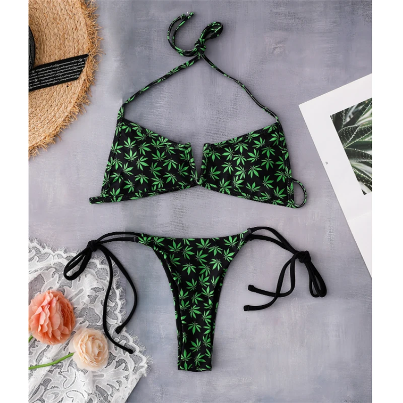 Купальник женский GNIM, V-образный вырез, комплект бикини с принтом листьев дерева, бандо, купальник из 2 предметов, бандаж, стринги, бразильский купальник, халтер, бикини, 2021