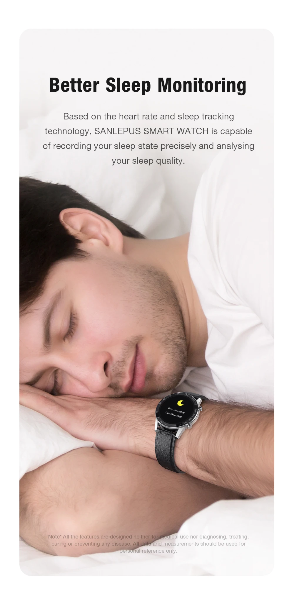 Умные часы SANLEPUS на основе технологии отслеживания сердечного ритма и сна способны точно записывать состояние сна и проверять качество сна.
