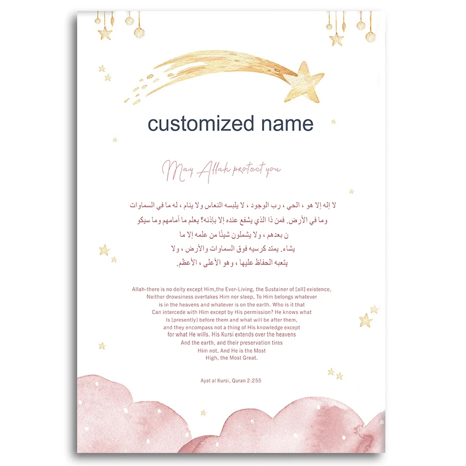 Розовая Ayatul Kursi с именем ребенка, маленькая мусульманская Картина на холсте, мусульманские настенные художественные принты, картины, постеры для комнаты для девочек, домашний декор
