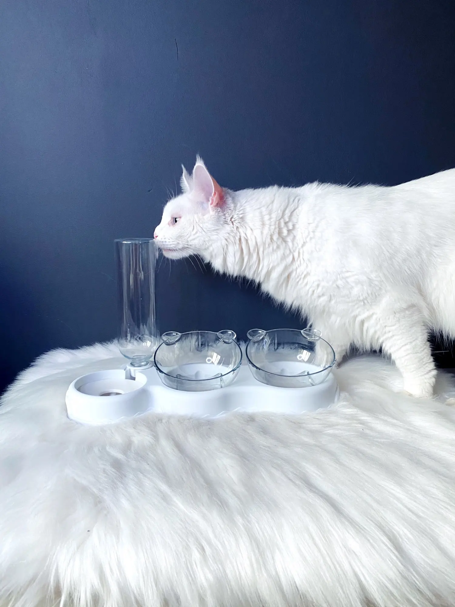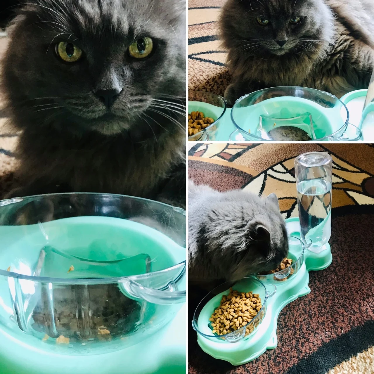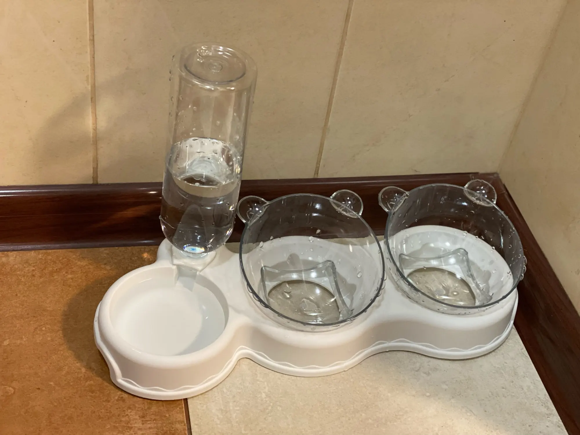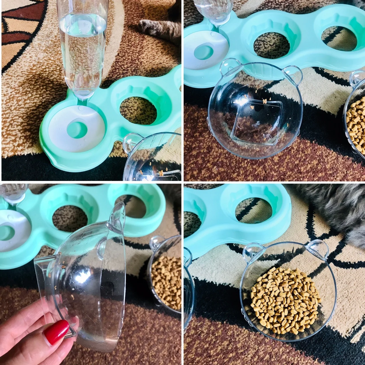 Очень удобная миска с поилкой для кошек, все ёмкости съемные, поилка для воды большого размера, можно оставить кота на несколько дней, вода поступает очень хорошо, котик пьет водичку из неё, ему нравится. В одну ёмкость я кладу влажный корм, в другую ёмкость сухой корм, миски котику очень понравились, доставка была быстрая за 2 недели в Россию, рекомендую продавца)