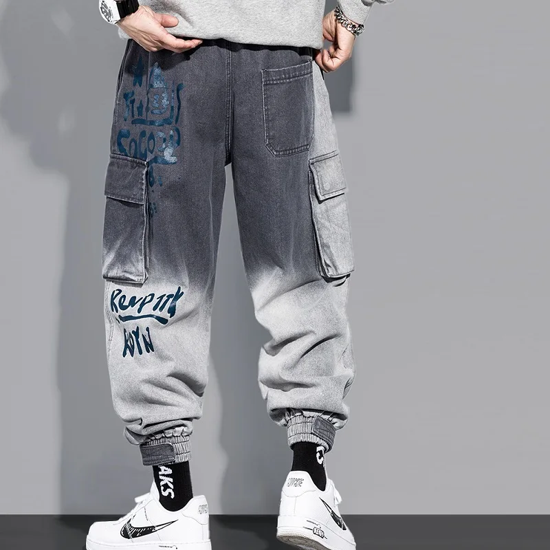 Мульти-карман градиент Цвет джинсы с инструментами для мужчин на весну и на осень Брендовая обувь в Корейском стиле; Свободные повседневные брюки для бега для мужчин