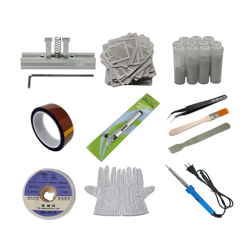Этот набор включает в себя посадочную платформу, стальную сетку, Оловянные шарики, шестигранный ключ, щетку, скребок и так далее. Пожалуйста, проверьте список содержимого для получения подробной информации.