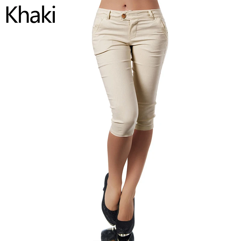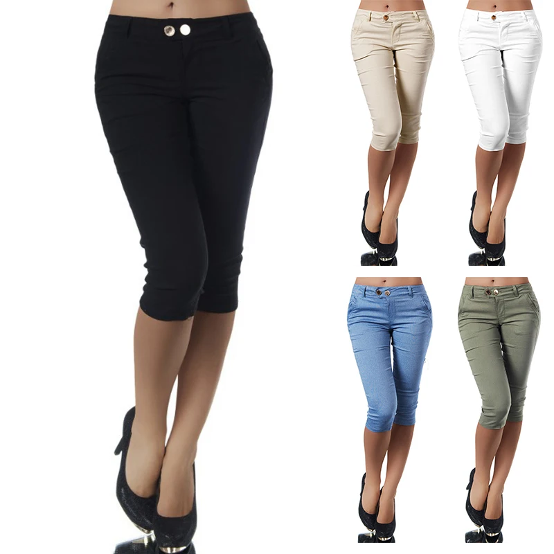 Женские узкие брюки, летние узкие брюки с карманами и пуговицами, повседневные Стрейчевые брюки длиной 3/4 размера плюс, женские Капри, Новинка