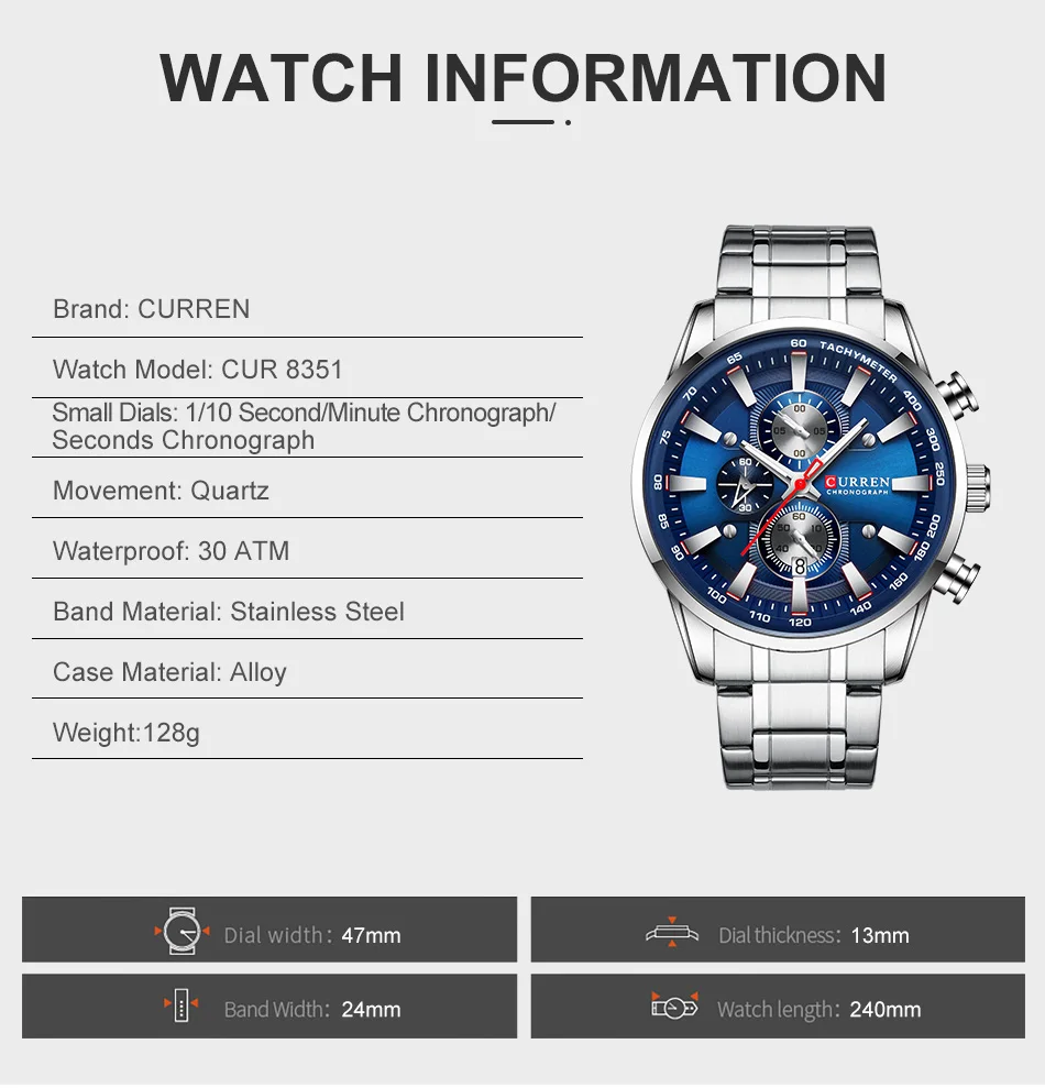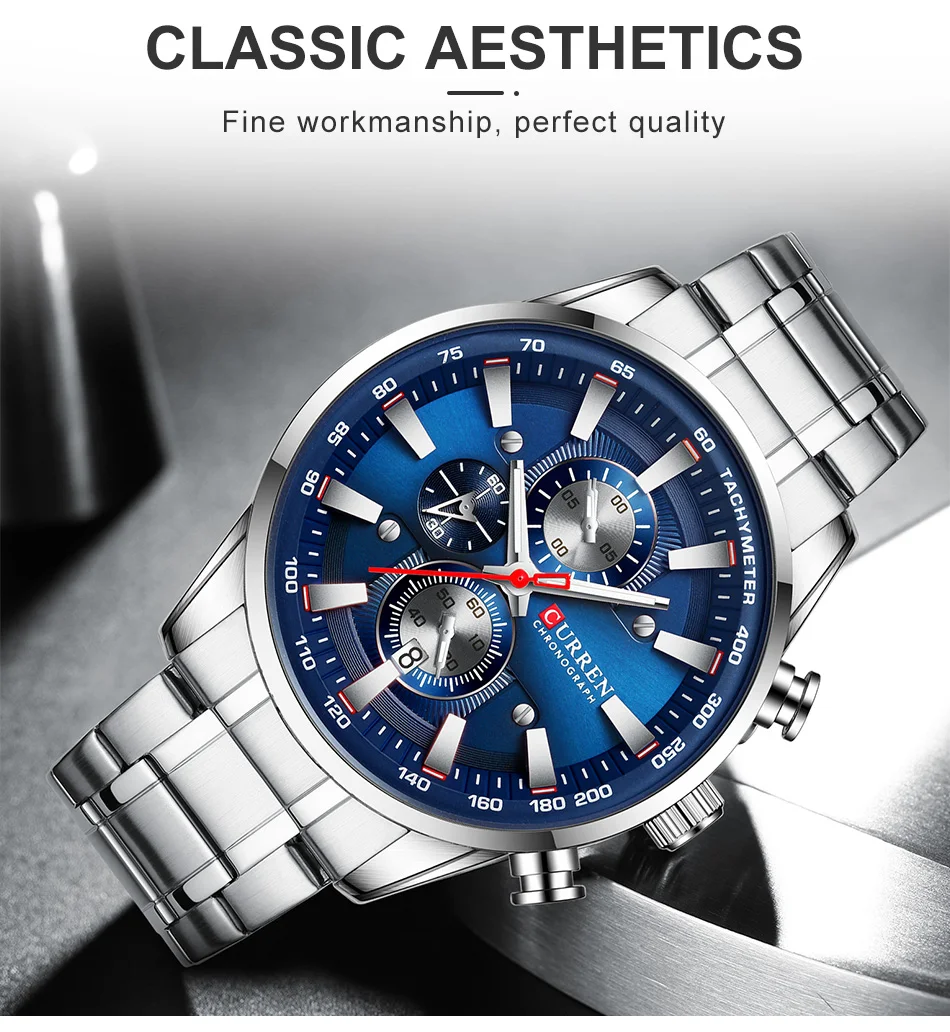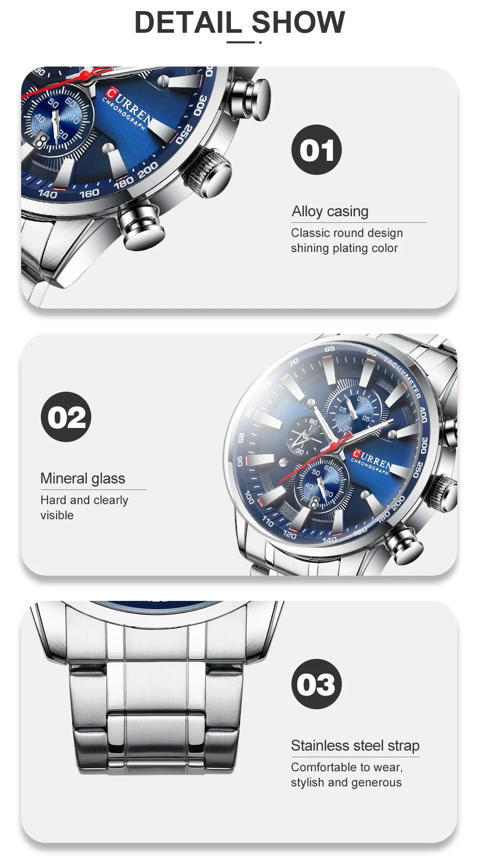 Часы наручные CURREN Мужские кварцевые, роскошные спортивные водонепроницаемые с хронографом и датой