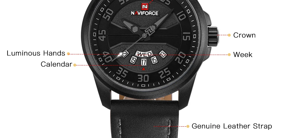 Описание:-100% Новинка и высокое качество.-Точный японский импортный кварцевый механизм для точного сохранения времени.-Ежедневная Водонепроницаемость 3 АТМ, идеально подходит для защиты небольших объемов воды, таких как мытье рук/Пот/дождь, но нельзя класть в воду, душ или плавание.-Цвет может отличаться от реального из-за различий между компьютерными мониторами и восприятием глаз.-Упаковка с/без подарочной коробки, это довольно хороший подарок для семьи/друзей/любимого человека/себя.-Приветствуются оптовые продажи и прямые поставки, пожалуйста, свяжитесь с нами в любое время, чтобы получить оптовую и другую цену. O (✮_ ✮) O Особенности (прибл.):-Диаметр корпуса: 45 мм-Толщина корпуса: 13 мм-Ширина ремешка: 22 мм-Длина ремешка (чехол в комплекте) : 240 мм-Вес часов: 159 г-Материал ремешка: натуральная кожа-Регулируемый ремешок: Да-Питание от высококачественного импортного японского движения и аккумулятора-Функция автоматической даты и недели-Ежедневная Водонепроницаемость 3 АТМ (не подходит для душа и плавания) Посылка1x100 оригинальные часы NAVIFORCE