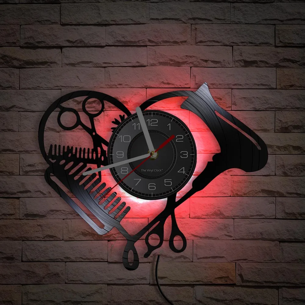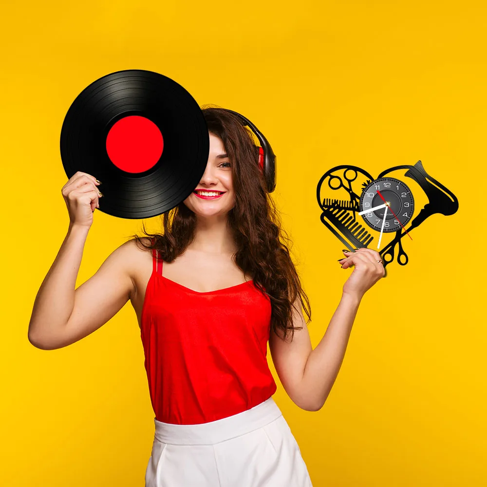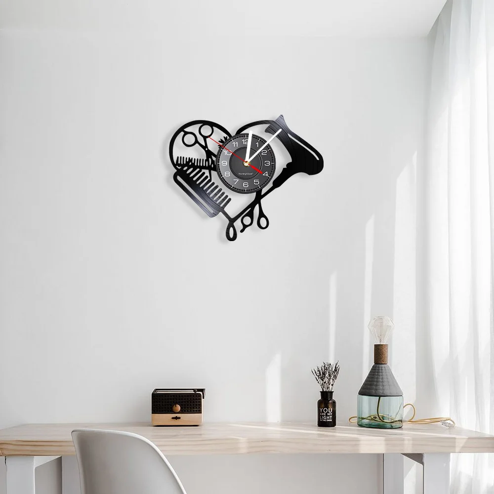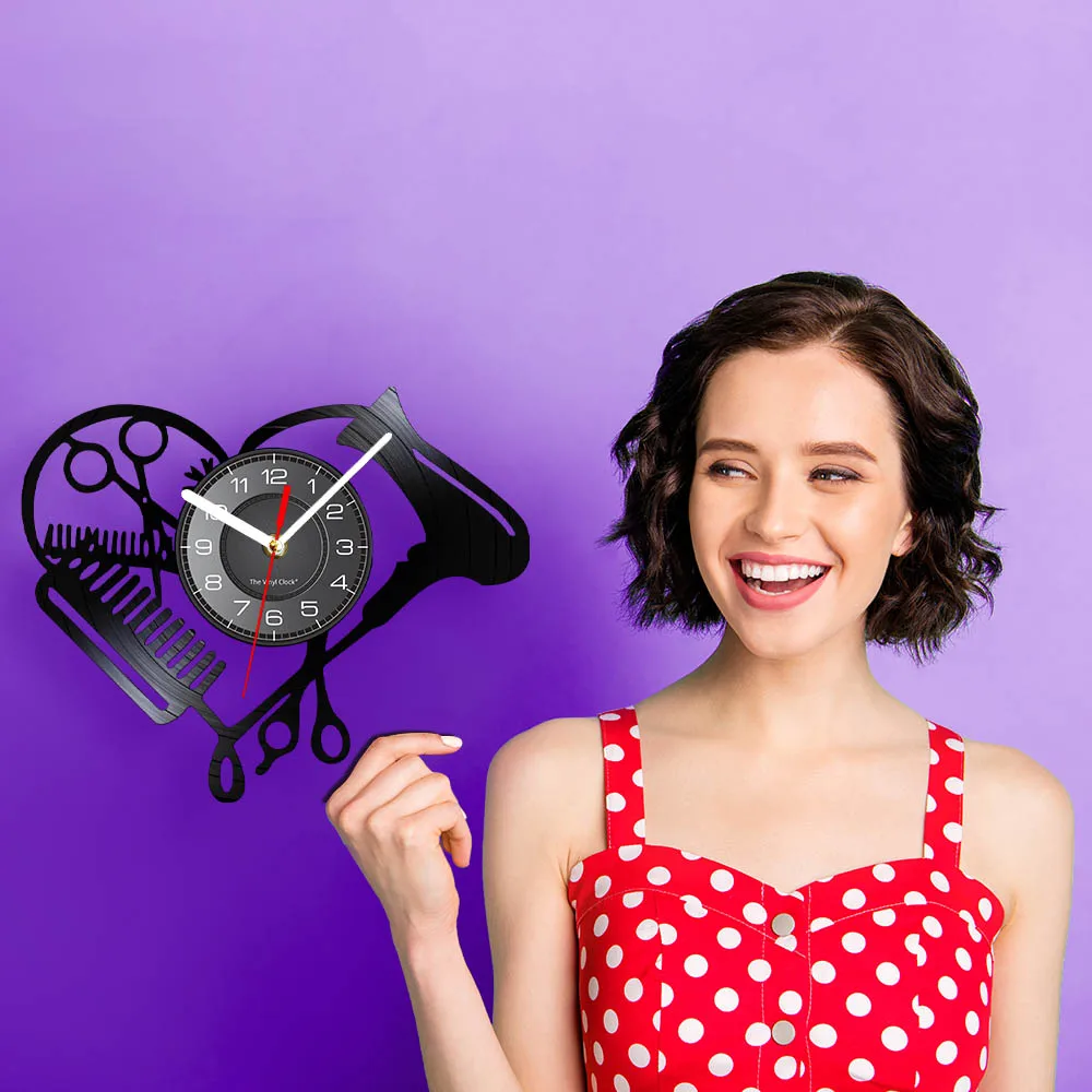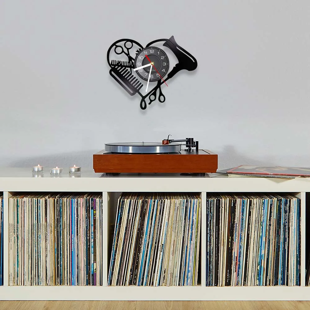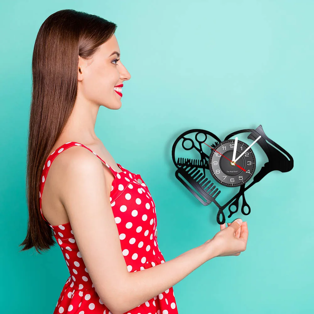 Настенные часы в форме сердца с виниловой пластиной для парикмахерской, инструменты для салона красоты, фен для волос, дизайн стилиста с бесшумными часами