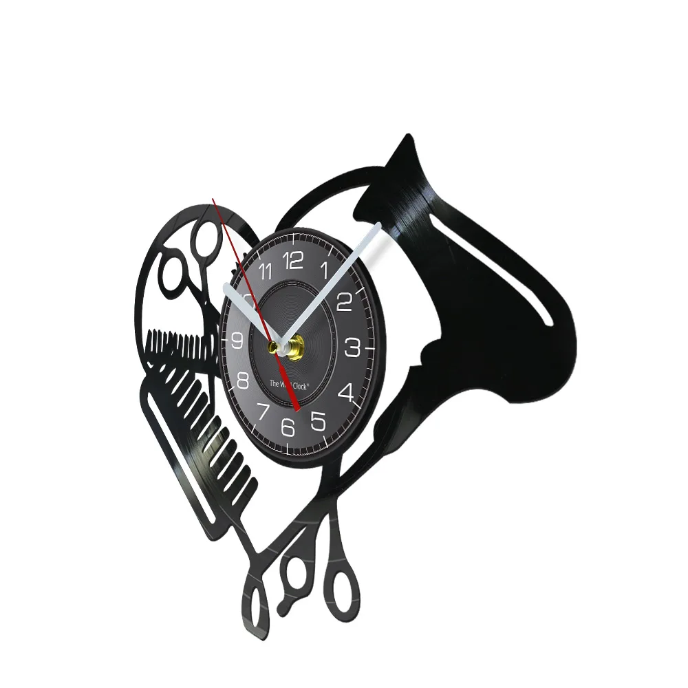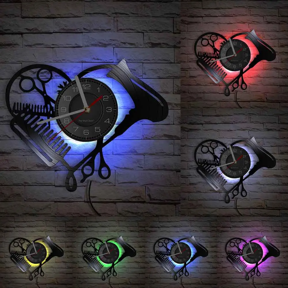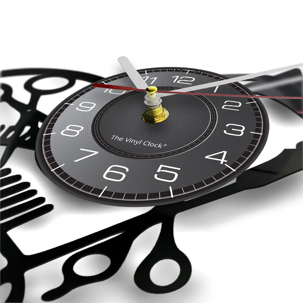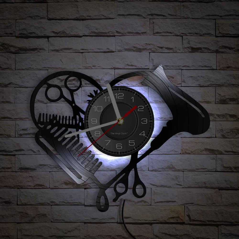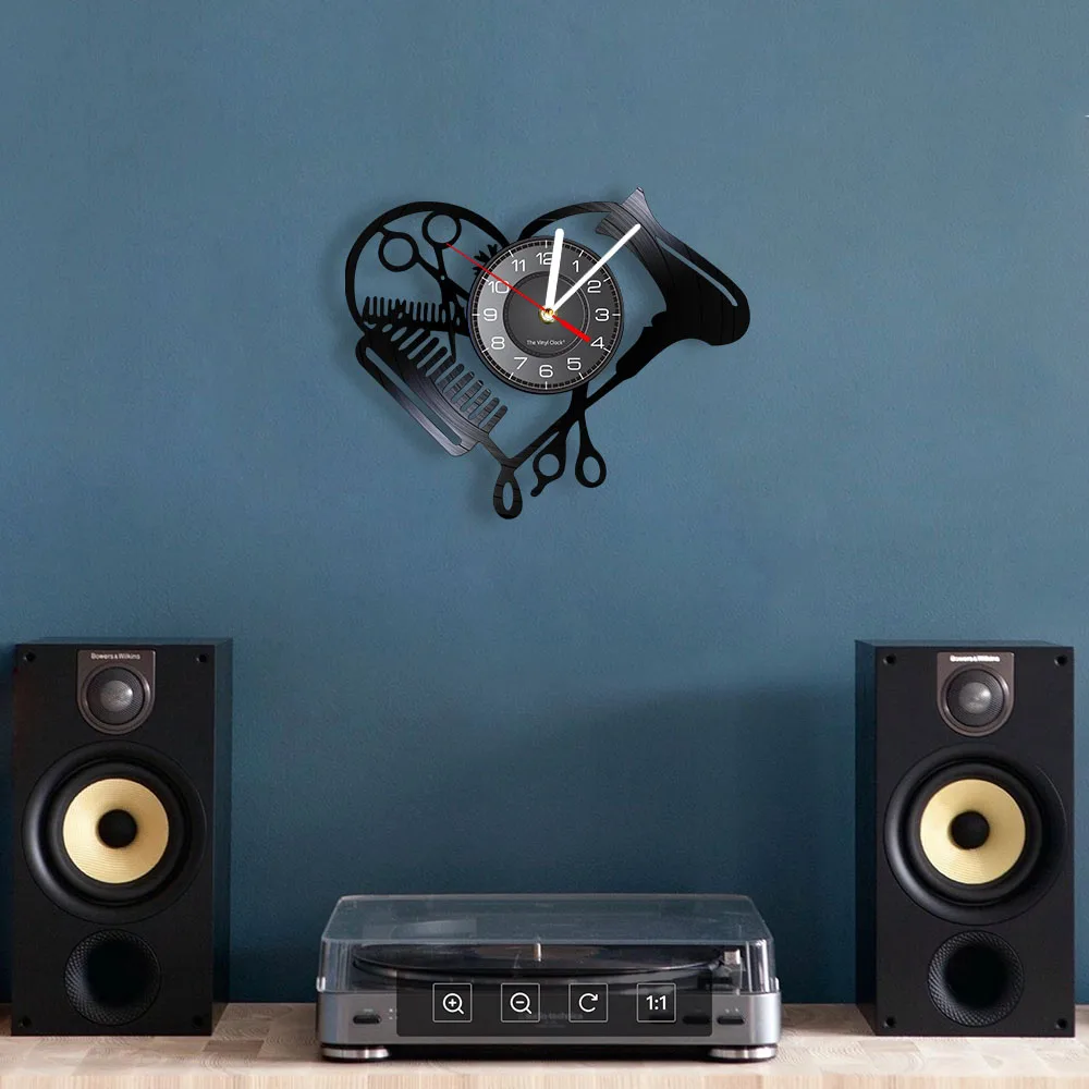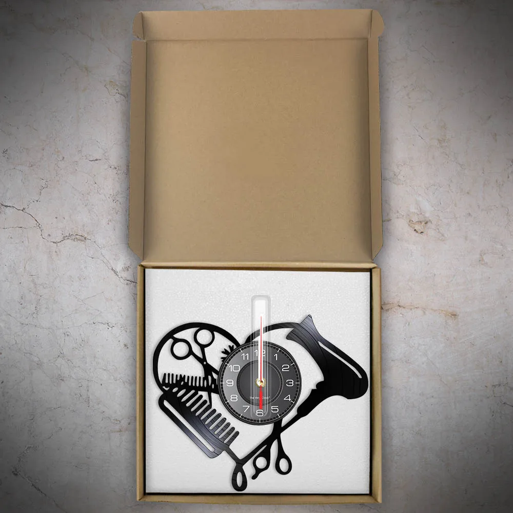 Настенные часы в форме сердца с виниловой пластиной для парикмахерской, инструменты для салона красоты, фен для волос, дизайн стилиста с бесшумными часами