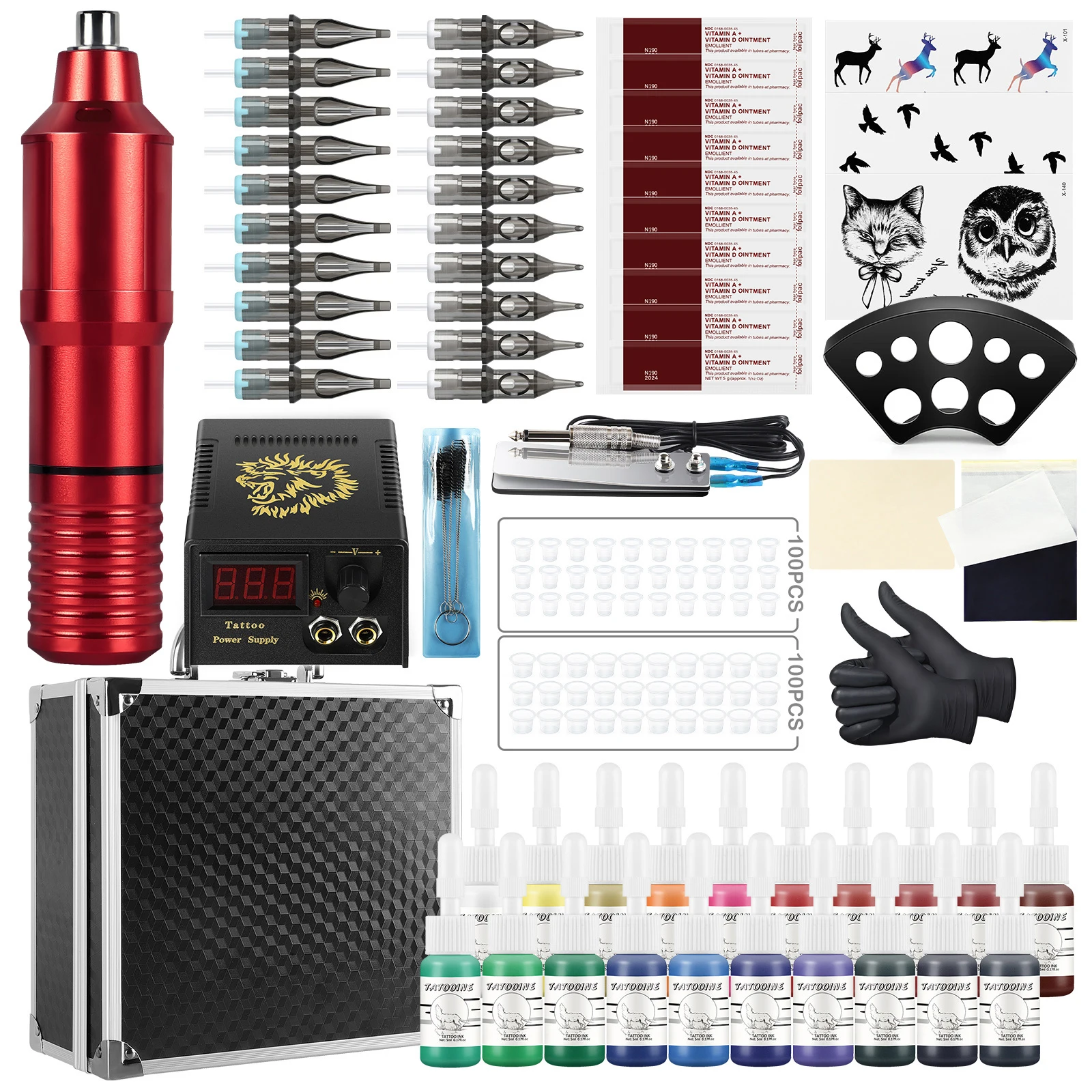 Мини ЖК-дисплей Dual Power Supplyx1Педализатор для ног x1Тату Machinex120 шт./кор. татуировки Needlesx120 шт тату Inksx1Татуировка Cuos чернила Holderx1100 маленьких цветов cupsx1100 средних цветов cupsx1Белая Татуировка практика Skinx1Бумага для переноса татуировок x12 шт одноразовые Glovex1После сливок x10Татуировочная щетка x1Маленькая птичка Tatto Stickerx1Олень Tatto Stickerx1Сова Tatto Stickerx1Алюминиевый комплект татуировки Box1