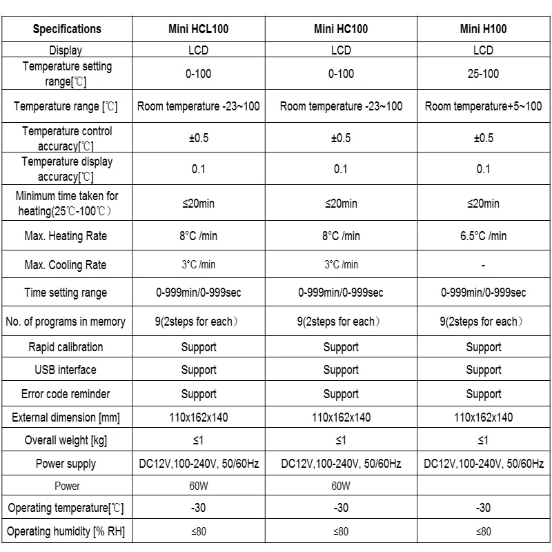 Особенности: • Весовой светильник• ЖК-дисплей температуры и времени.• Поддержка быстрой калибровки• Защита от перегрева.• Дополнительные блоки с различной емкостьюДоступно.• Безопасный и стабильный.• Usb-интерфейс для сохранения данных• Мини HCL100 с горячей крышкойСохраните генерируемое тепло.