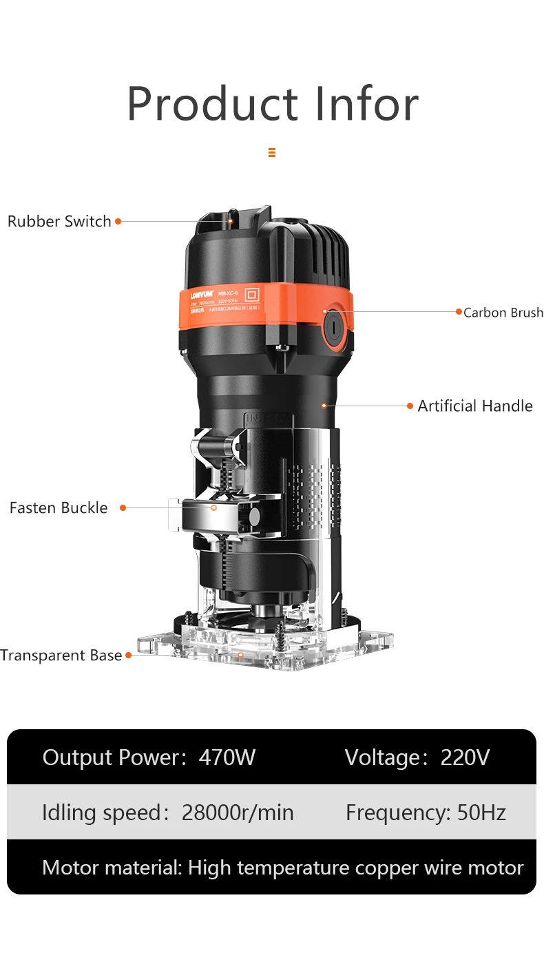 Фрезер ручнойТехнические характеристики:Выходная мощность: 470 ВтНоминальное напряжение: 220 ВСкорость холостого хода: 28000об/минНоминальная частота: 50 ГцМатериал двигателя: высокотемпературный медный провод двигателяПосылка включает в себя:1 x деревянный Электрический триммер1 x ключи, дюймовый стандарт1 х Руководство по сборке триммера1 х прямой направляющий узел1 x красно-коричневый, белыйОсобенности:С прозрачной основой, обрабатывающие работы можно смотреть четко.Принимает полностью Медный двигатель с сильной мощностью, он имеет более стабильную производительность.Внешняя конструкция угольной щетки удобна для замены.Легкий с проводным дизайном, удобный для ежедневной эксплуатации и переноски.Подходит для резки дерева, обрезки, долбления и изготовления отверстий.Может использоваться для обработки дерева, обработки шкафа, рукоделия.