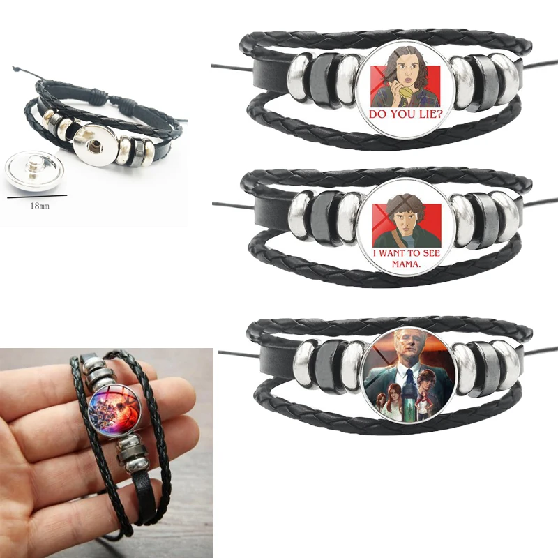 Черный классический кожаный браслет, модный круглый значок из Алисы...