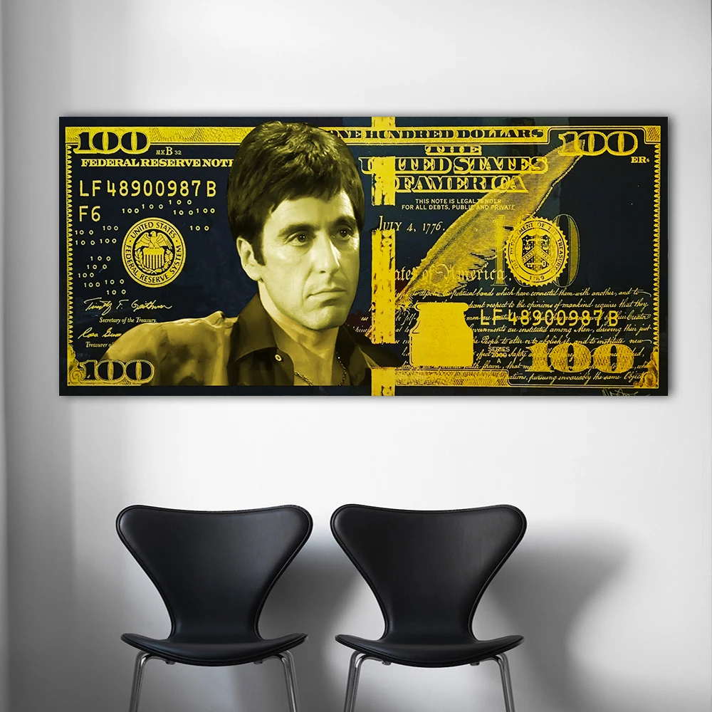 Картина на холсте Tony Montana, золотая, 100 доллара, художественные плакаты и принты алый, настенная живопись, портрет для декора гостиной