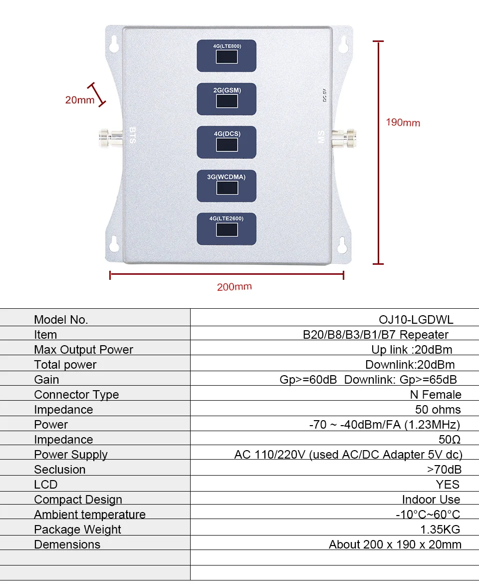 Band20 800 МГц Band7 2600 МГц Band8 900 МГц Band3 1800 МГц Band1 2100 МГц Band5 850 МГц LTE ретранслятор точка продажи:
