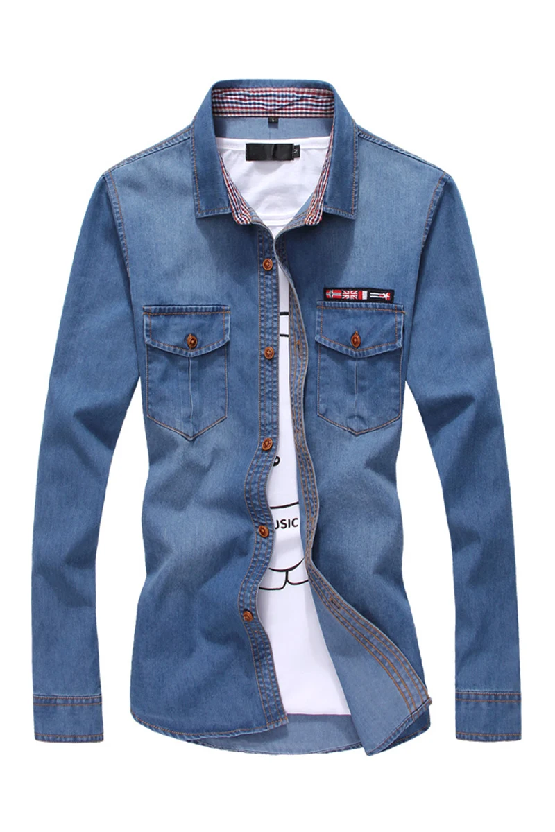 Размера плюс Мужская джинсовая рубашка с отложным воротником и карм...