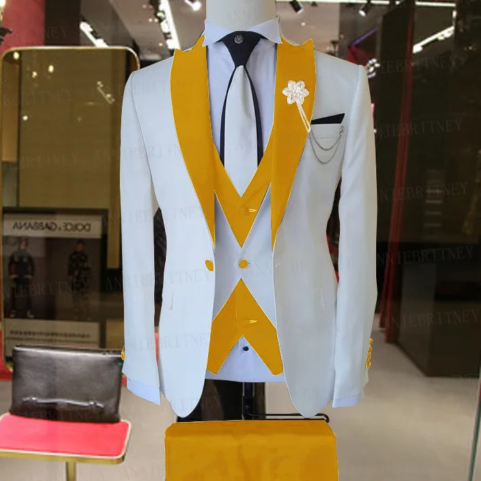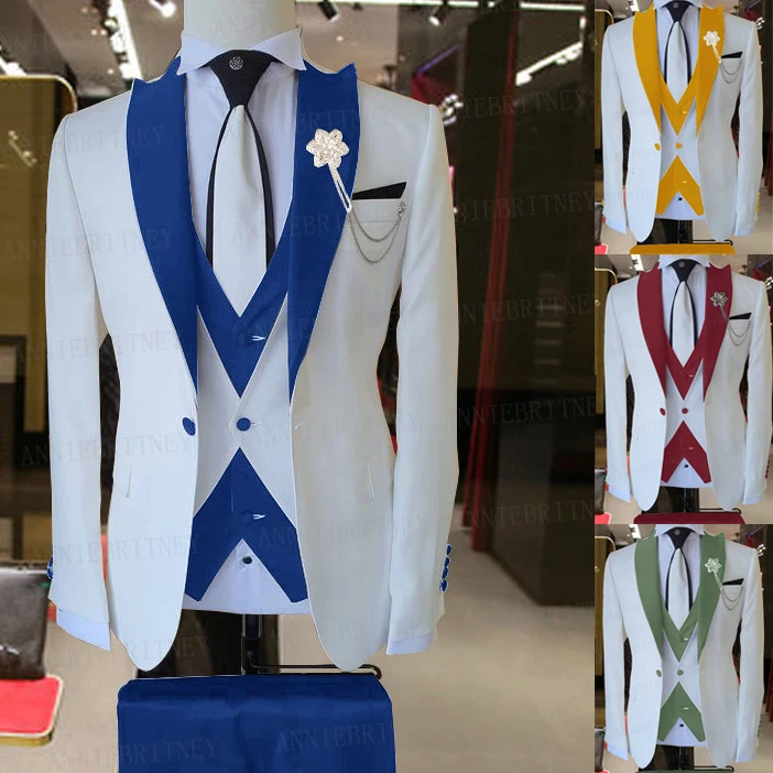 2021 бренд мужской костюм комплект из 3 предметов жениха мужской свадебный костюм набор модных дизайнах белый деловой жакет без рукавов тёмно-синие штаны платье смокинг