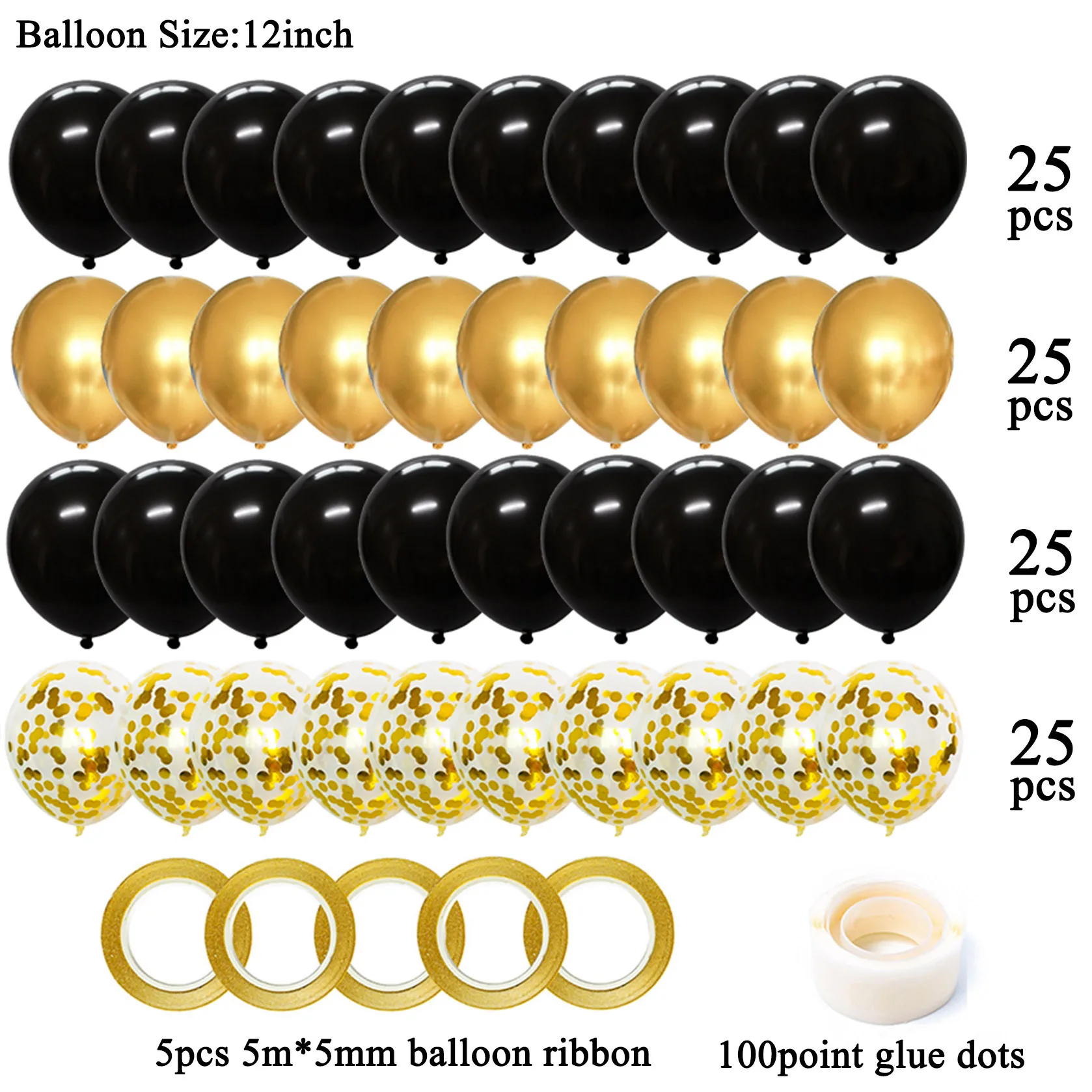 100 шт./компл. Смешанные 12 дюймов воздушные шарыНабор включает в себя: 25 шт. 12 дюймов конфетти воздушные шары, 25 шт. 12 дюймовое металлическое воздушные шары, 50 шт в наборе 12 дюймов латексные шары, 5 предмета в комплекте 5 м * 5 мм лента для воздушных шаров, 1 упаковка из 100 точек клеевых точек.Во всех изделиях используется 2,8 г воздушные шары хорошего качества.Вы можете использовать инструмент для надувания. Он может плавать при заполнении гелием.Подходит для различных вечерние украшения: День рождения, свадьба, детский душ, новый год, тема русалки, тема динозавра и т. Д.Примечание:Будет разница в цвете между цветом воздушного шара и изображением, прежде чем он будет надут.Новые латексные шары будут немного пахнуть, просто будьте в порядке при взрыве.