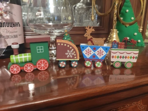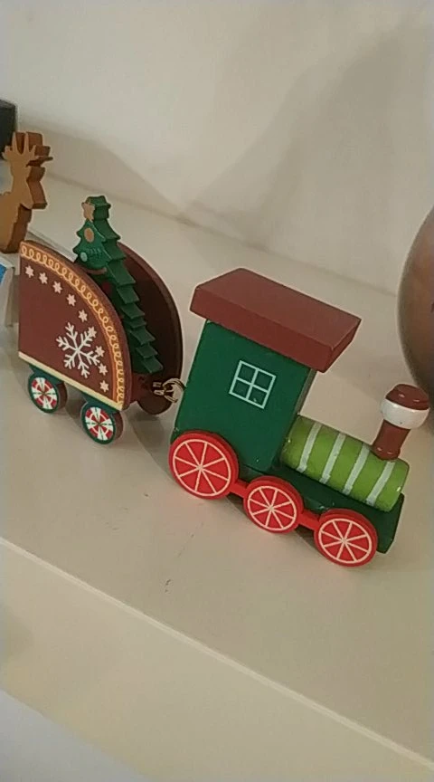 Товар получила с браком, отвалился олень. Соединительные крючки на разном уровне, поэтому первый вагончик висит на крючке.