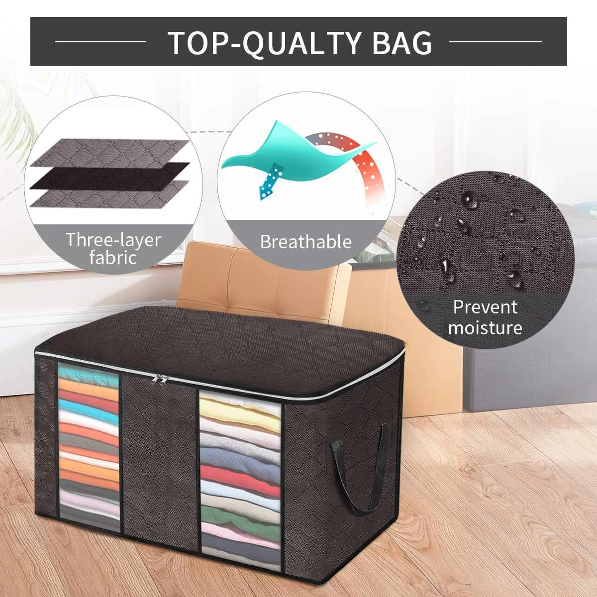 【Модернизированный прочный материал 】Органайзер для одежды изготовлен из высококачественного трехслойного композитного нетканого материала без запаха, который способствует вентиляции и защищает ваши хранящиеся вещи. Мы предоставляем 3 упаковки больших сумок для хранения одежды в одном комплекте, что стоит того, чтобы взять эти большие сумки обратно в свой дом для хранения одежды, одеял, одеял, подушек, постельного белья.