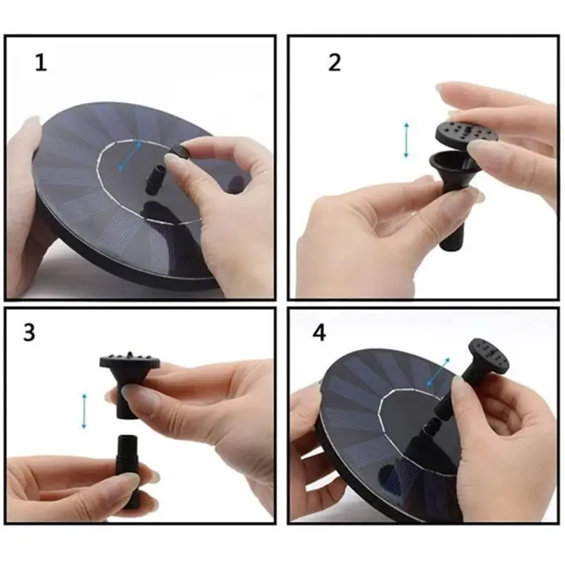 1. Характеристики: Подключение разных форсунок, высота распыления воды будет отличаться. Когда солнечная панель получает достаточно солнечного света, водяной насос начнет работать в течение 3 секунд.