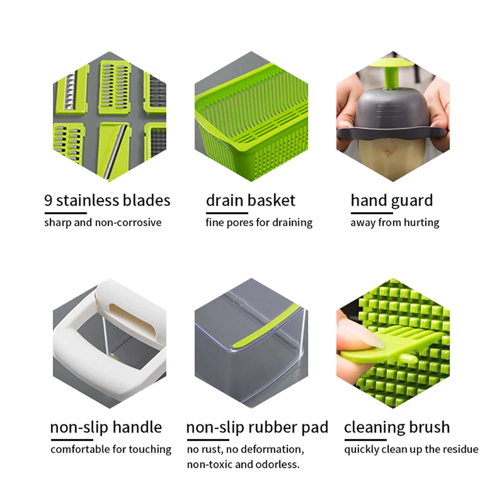 С помощью этого кухонного набора для резки вы можете сэкономить 70% времени, попрощайтесь с водянистыми глазами, когда нарезаете лук; И поможет вам готовить еду более элегантно.