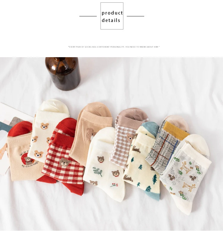 Носки женские с рисунком медведя и животных, милые дизайнерские в японском стиле в клетку, уличная одежда