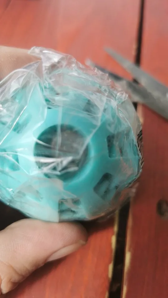 хороший мячик, правда, имеет химозный запах. самый маленький размер отлично подошёл для таксы. корм держится хорошо, хотя на первый взгляд так и не скажешь. у меня корм мелкий, влезает по две штуки в каждую лунку. я бы его сфотографировала, но собака его куда-то спрятала
