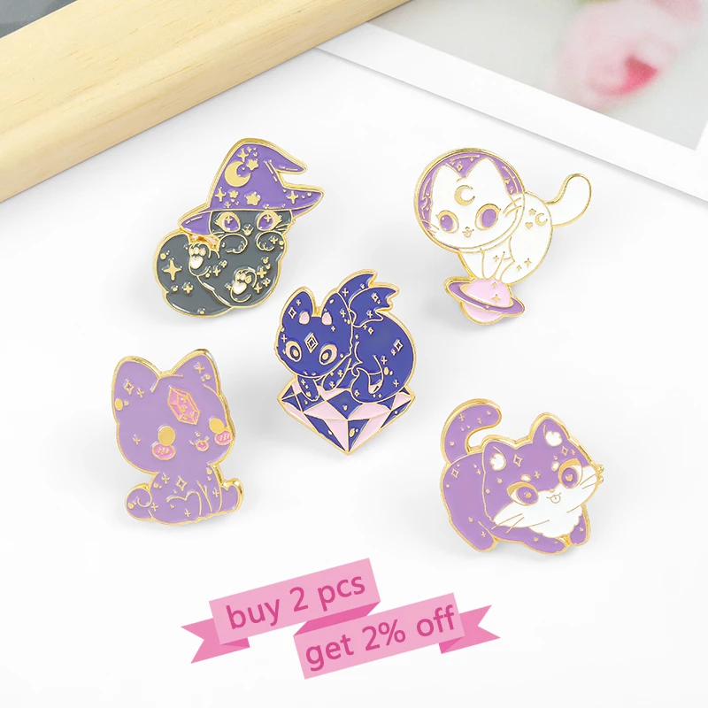 Эмалированные значки в виде фиолетового кота, шляпы ведьмы и хруста...