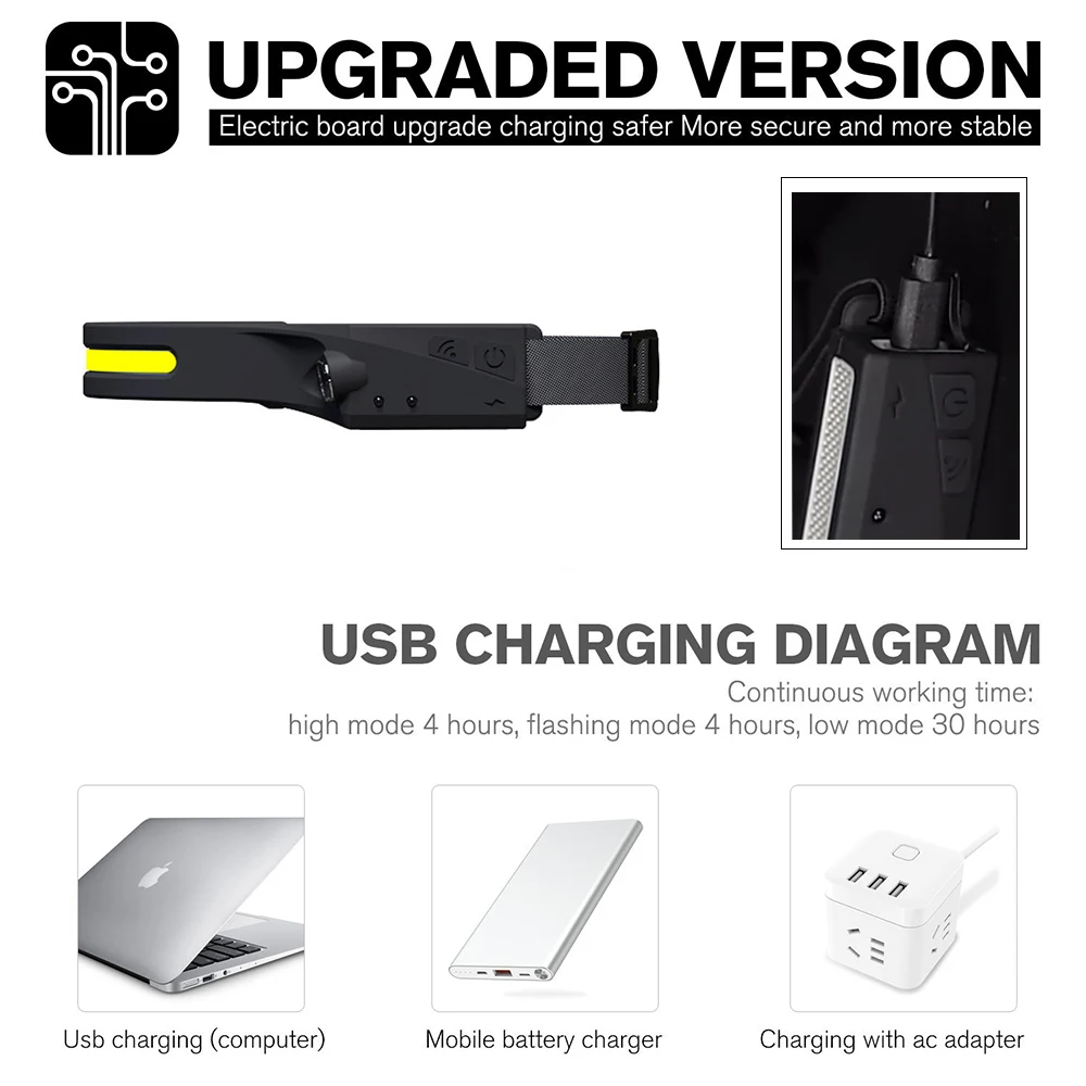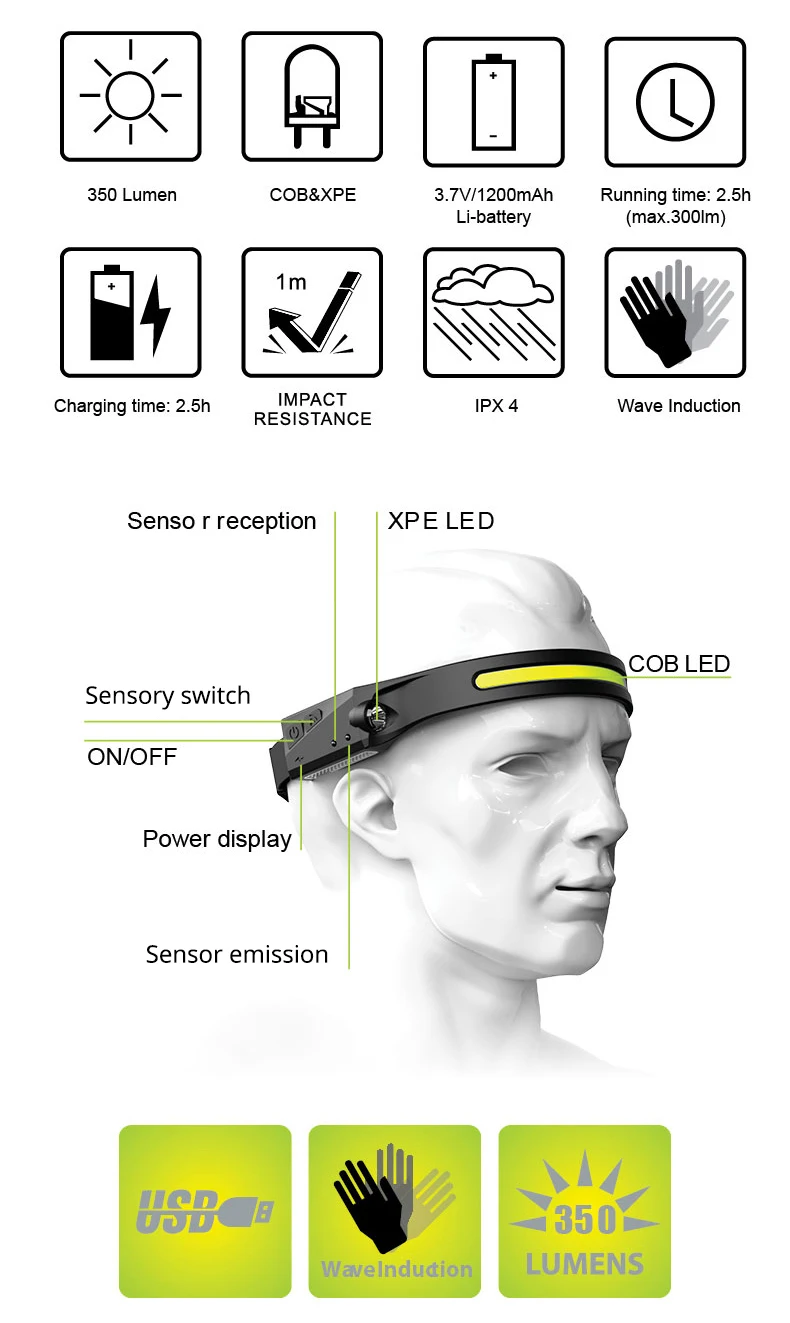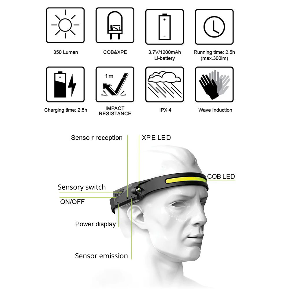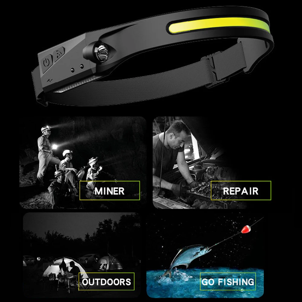 Перезаряжаемый через USB налобный фонарь COB с сенсорным прожектором COB + XPE 3 режима освещения, подходящие для пеших походов, экспедиций и т. д.