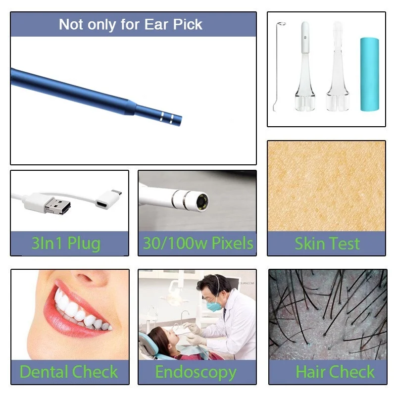 1. Этот USB earoscope является универсальным дизайном, который вы можете использовать на вашем Android телефоне, Windows и Mac системах, ПК и ноутбуках. Дополнительный usb-адаптер. Вставьте для использования! Линзы для ушной ложки можно мыть. Usb-интерфейс нельзя стирать, лучше стирать спиртом.2,3-в-1 дизайн USB эндоскоп бороскоп: эта модель сочетает в себе 3 штепсельных Тип s пряди для наращивания волос для Тип-C, Android micro USB и USB порт компьютера, которые позволяют ему хорошо работать со смартфоном Android 4,2 + с функцией OTG и UVC и Android смартфоном/планшетом с портом micro USB, а также Windows XP/Vista/ 7/8/10/MAC ПК или ноутбуки с usb-портом. Нет необходимости в дополнительной конвертации кабеля, гибкое использование для различных устройств.3. Универсальный: он может проверить слуховой канал, а также барабанную перепонку, рот, десны, горло, полость носа, корни волос головы и другие части тела. Ушные ложки длиннее, тоньше и проще в использовании. Не только отлично подходит для ваших ушей, но и отличный инструмент для ваших собак.4. Эндоскоп для очистки ушей не только может проверить слуховой канал, но также может проверить барабанную перепонку, рот, десны, уши, нос, горло, полость носа, корень головы и другие части тела. Это незаменимый инструмент для каждой семьи, каждой классной комнаты, больницы для домашних животных и т. д. идеально подходит для докторов, медсестер, студентов и домашнего использования.5. Различные аксессуары, доступные для различного использования: вы можете просматривать видео в реальном времени вашего уха и удалять ушной воск более полностью и безопасно, сохранять фотографии и видео и отправлять специалисту здравоохранения для быстрой и легкой консультации.6.5.5 мм камера, регулируемый 6 светодиодный светильник s можно регулировать с помощью диммера кнопки блока управления в соответствии с вашими потребностями, широкое фокусное расстояние, широкое воздействие, значительно уменьшенное воздействие изображения, цветовые эффекты в темных или низких условиях светильник без искажений, Дисплей ушного канала наиболее реалистичное и четкое изображение линзы склеены внутри сопла, и размер линзы больше, чем сопло, так что он не будет падать, попрощайтесь с ослепляющим копанием, чистота и безопасность.